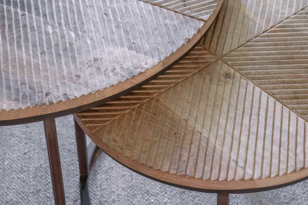 Our Aaasha nesting coffee tables are hand-carved with a simple yet striking geometric pattern that celebrates the natural tone of the wood grain and creates a design detail simply by working with the wood itself. Generously sized, with a pared-back silhouette and smooth stackability, this pair can be used in proximity or apart. Perfect in a seating area to add interest and as a place to display favourite books, a beautiful bowl or objet d’art. The contrasting use of natural mango wood with the rust hues of the iron frame is at once tactile and eye-catching, effortlessly adding a sculptural element to a living space. Versatile, beautiful and useful, these tables promise to become a timeless addition to any home. Also available as a pair of side tables.