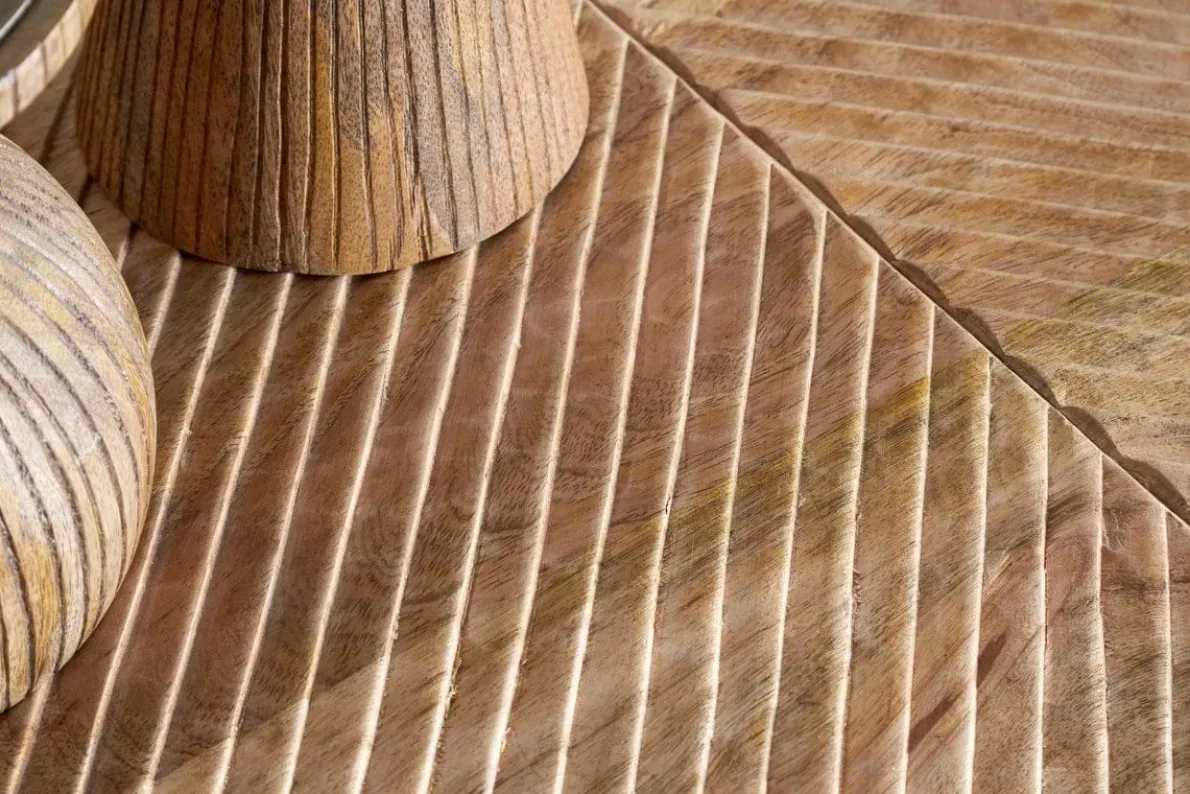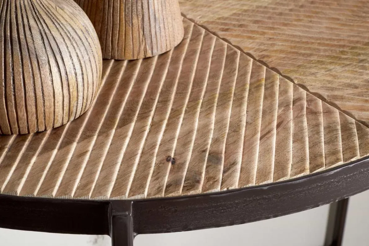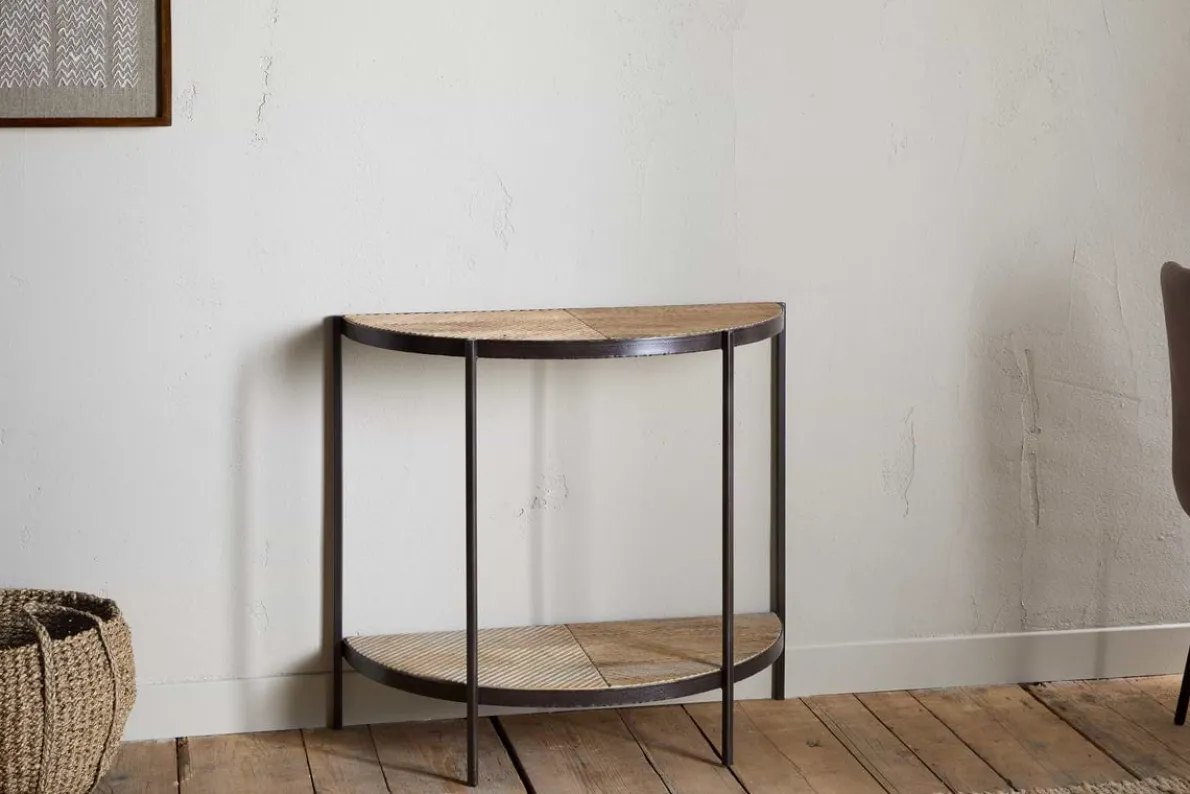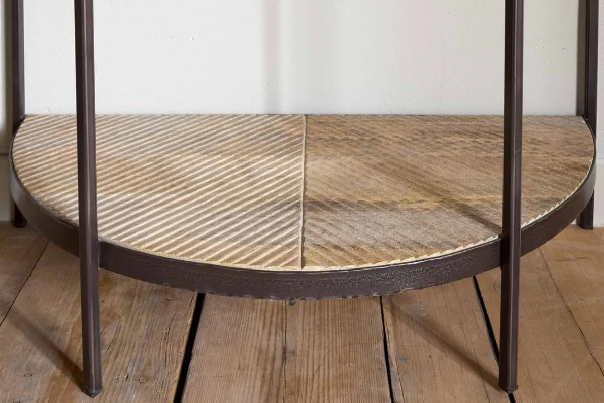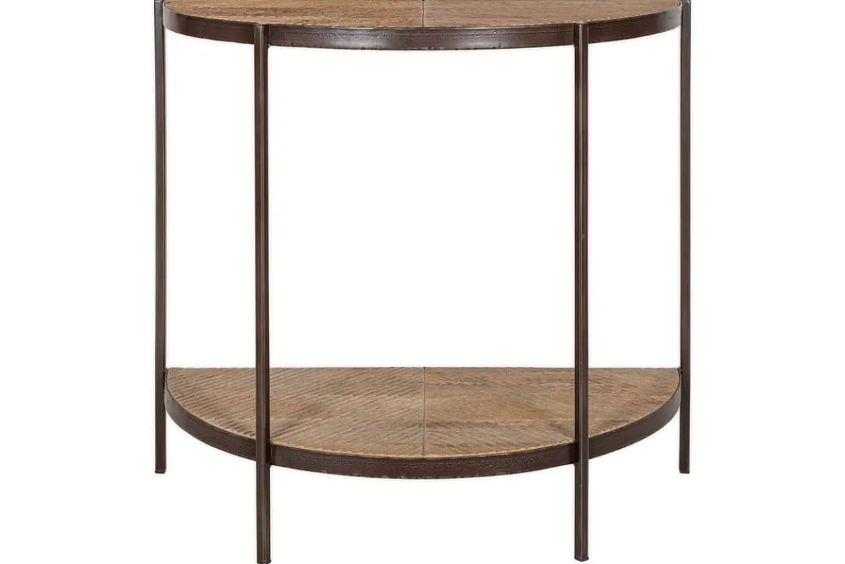 This striking half moon console table combines natural warmth with sculptural form. The mango wood top showcases an intricate carved design, adding texture and interest, while the rustic brown iron legs provide a bold contrast. Its slim profile makes it a perfect fit for hallways, entryways, or any space in need of a stylish accent.