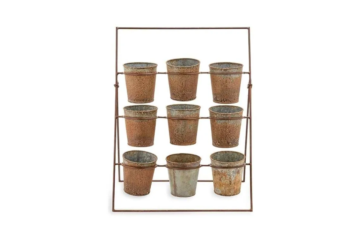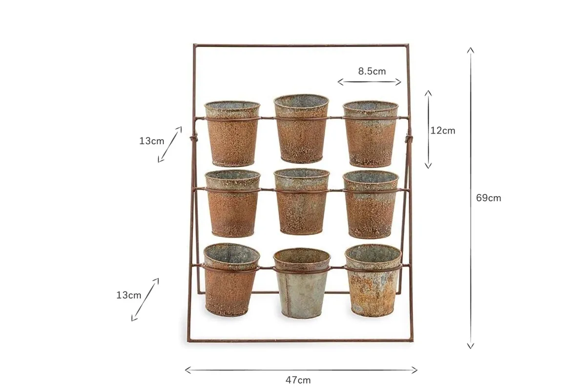 This Abari planter stand is the perfect way to dress up an outside area. Freestanding, the aged zinc frame holds nine individual plant pots. Each pot is crafted from aged zinc, rich with a rustic patina that will enhance and weather over time. The Abari stand looks stunning filled with herbs and plants and is perfect for any garden, terrace or balcony.