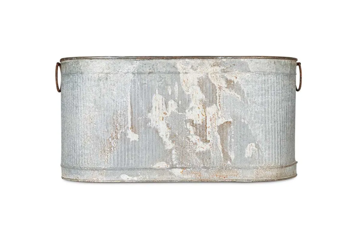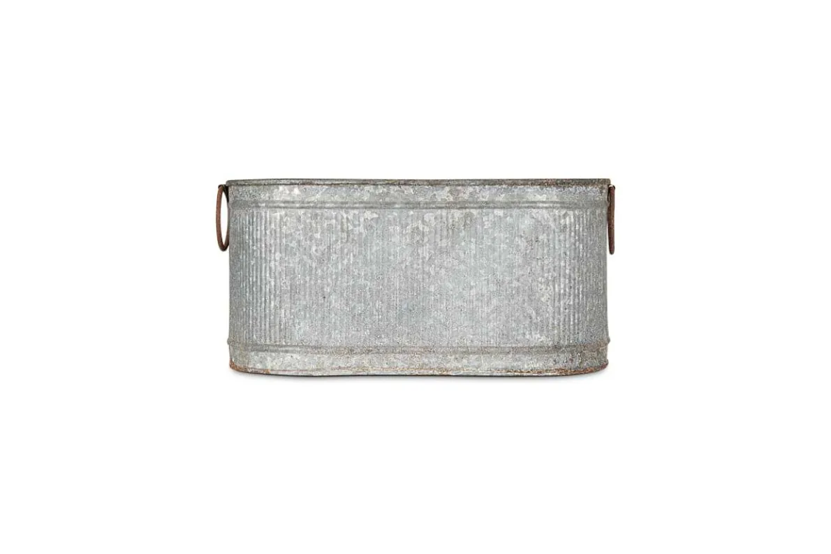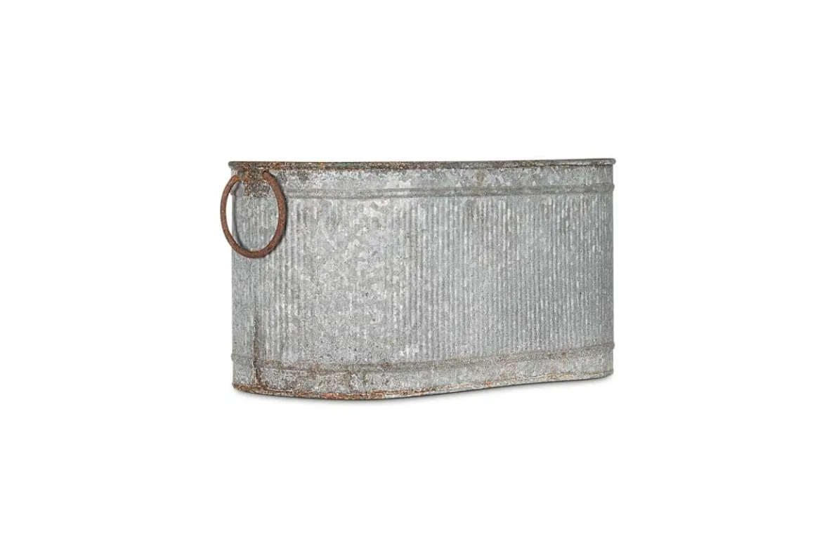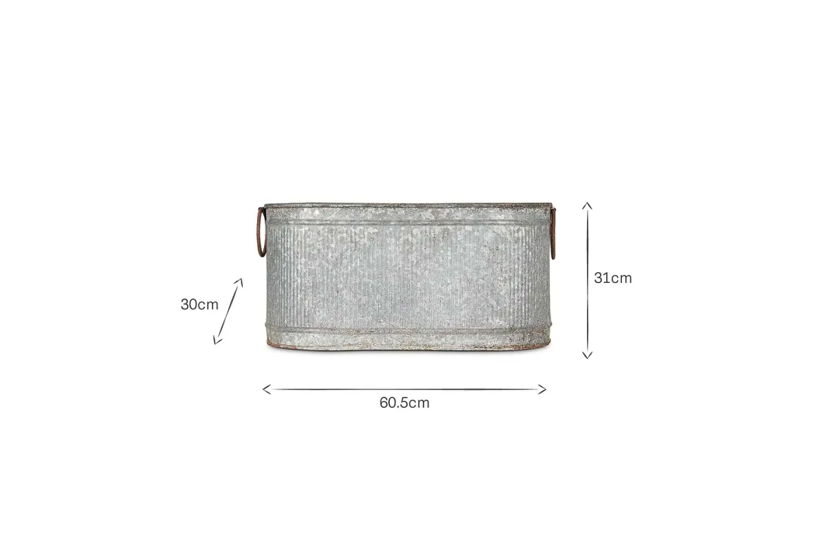Crafted from iron, our Akasa planter features an antiqued zinc finish that adds a touch of vintage allure. The trough shape offers ample space for a diverse array of plants, making it perfect for garden or patio decor. If left outside, the finish will gain a soft, weathered look, truly blending into the surroundings. We love it paired with terracotta and ceramic planters. Also available in a smaller size.