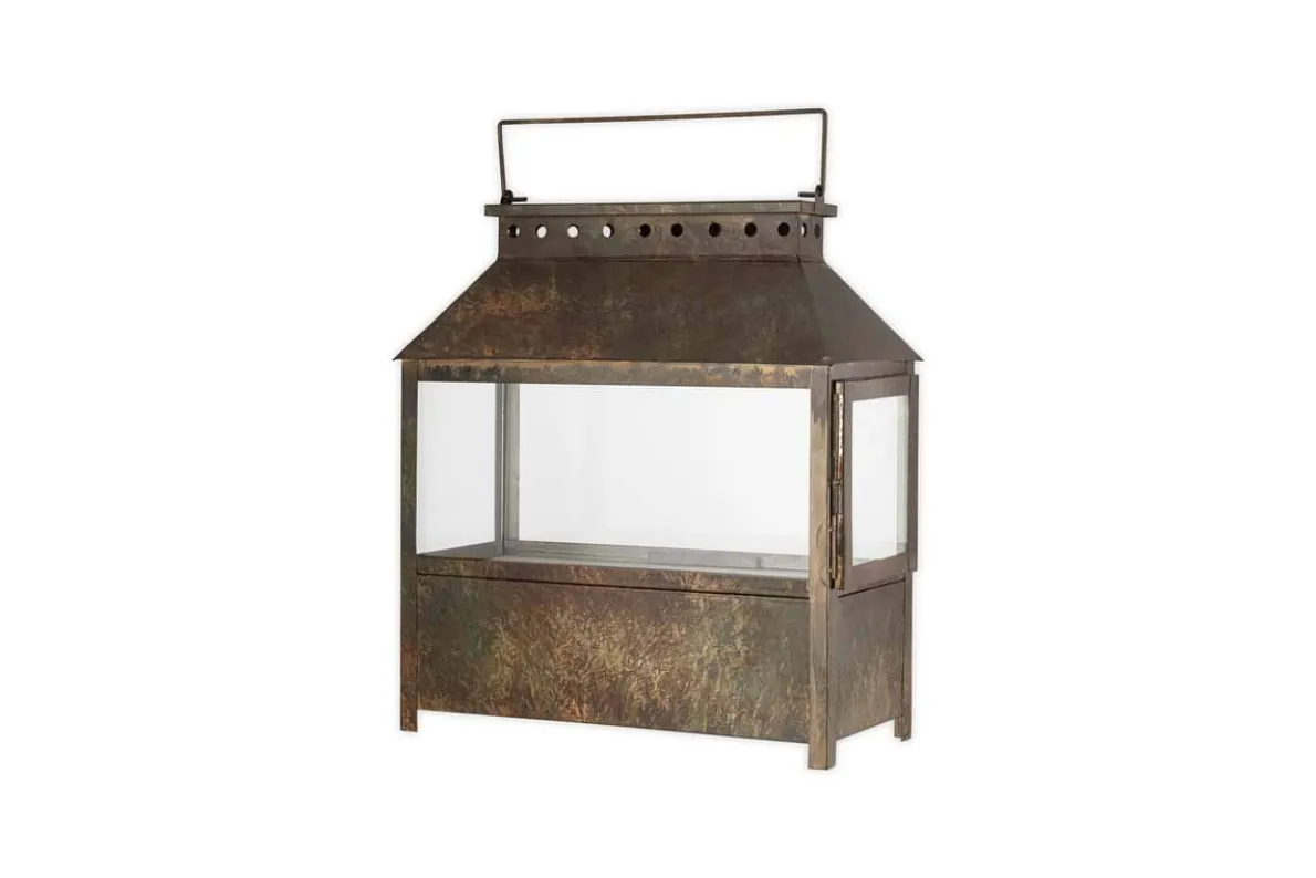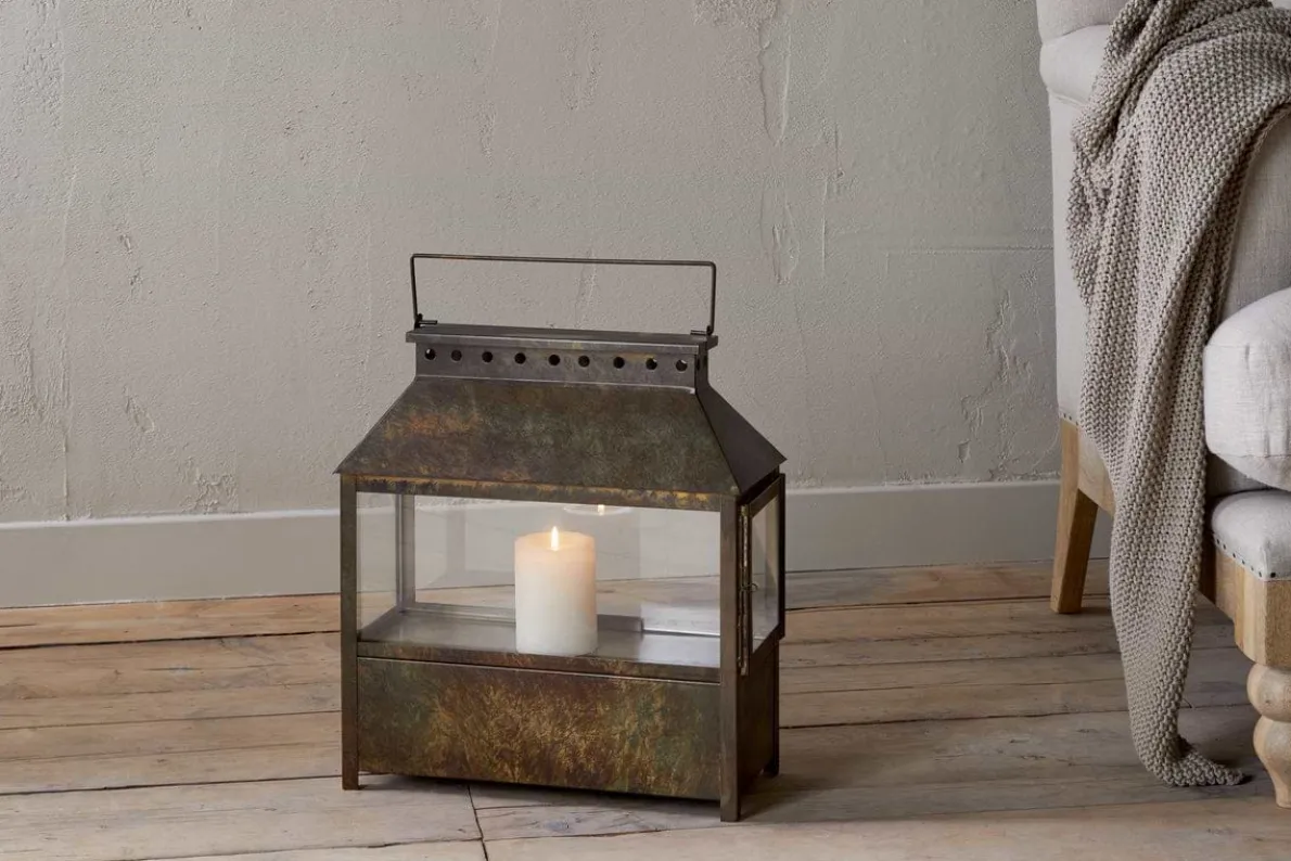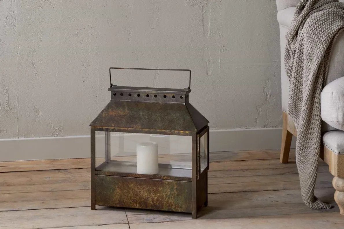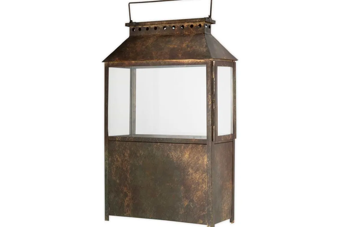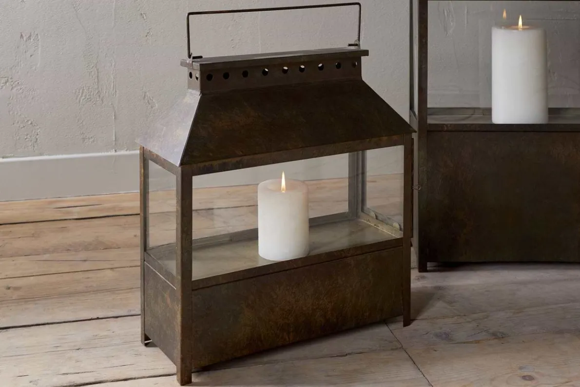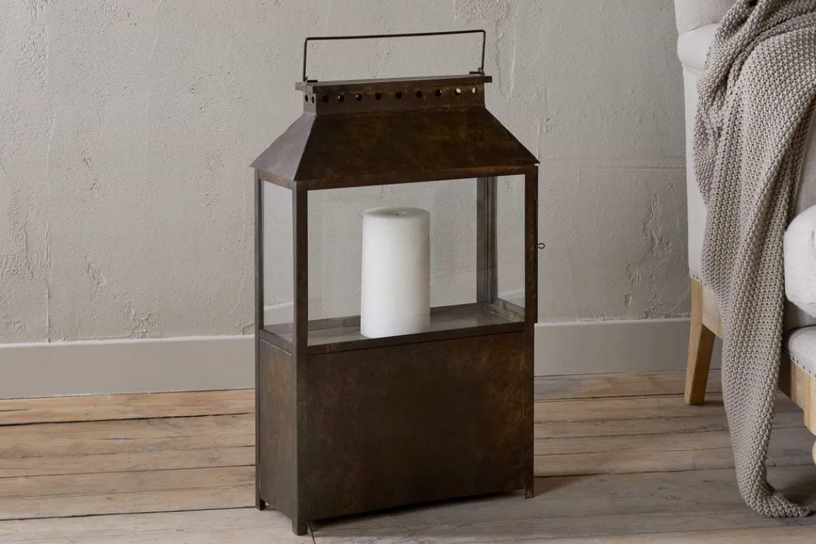 Part of our wide lantern collection, this piece features a solid lower section that gives it a grounded, substantial feel, ideal for floor display. Finished in a warm brown patina, it has an earthy, natural character that complements a variety of interior styles. Its versatile design makes it easy to style across a range of interiors. Available in two sizes.