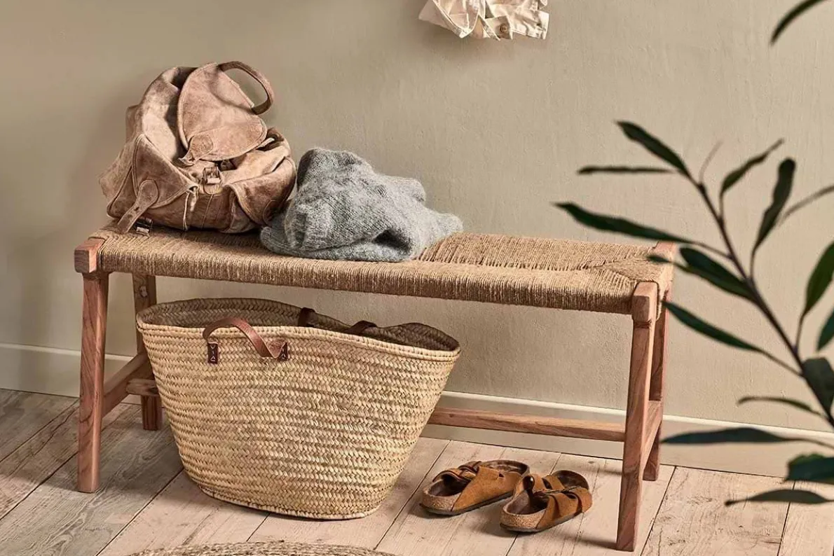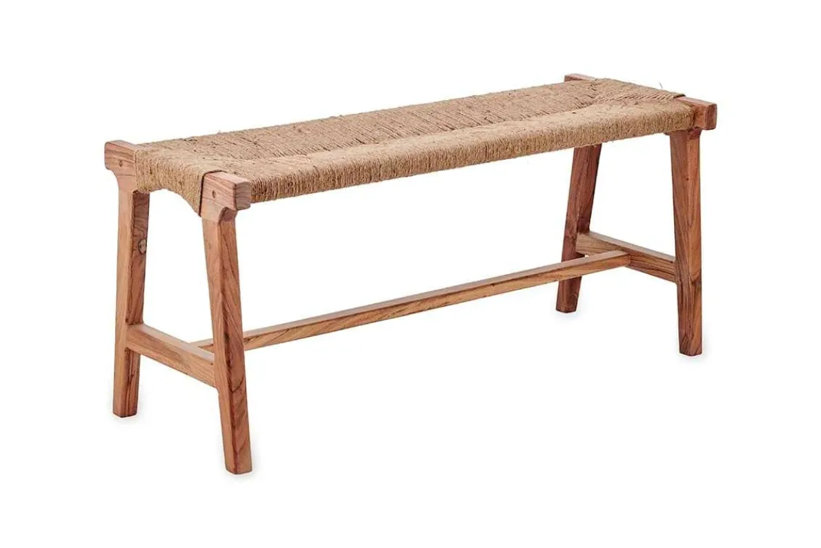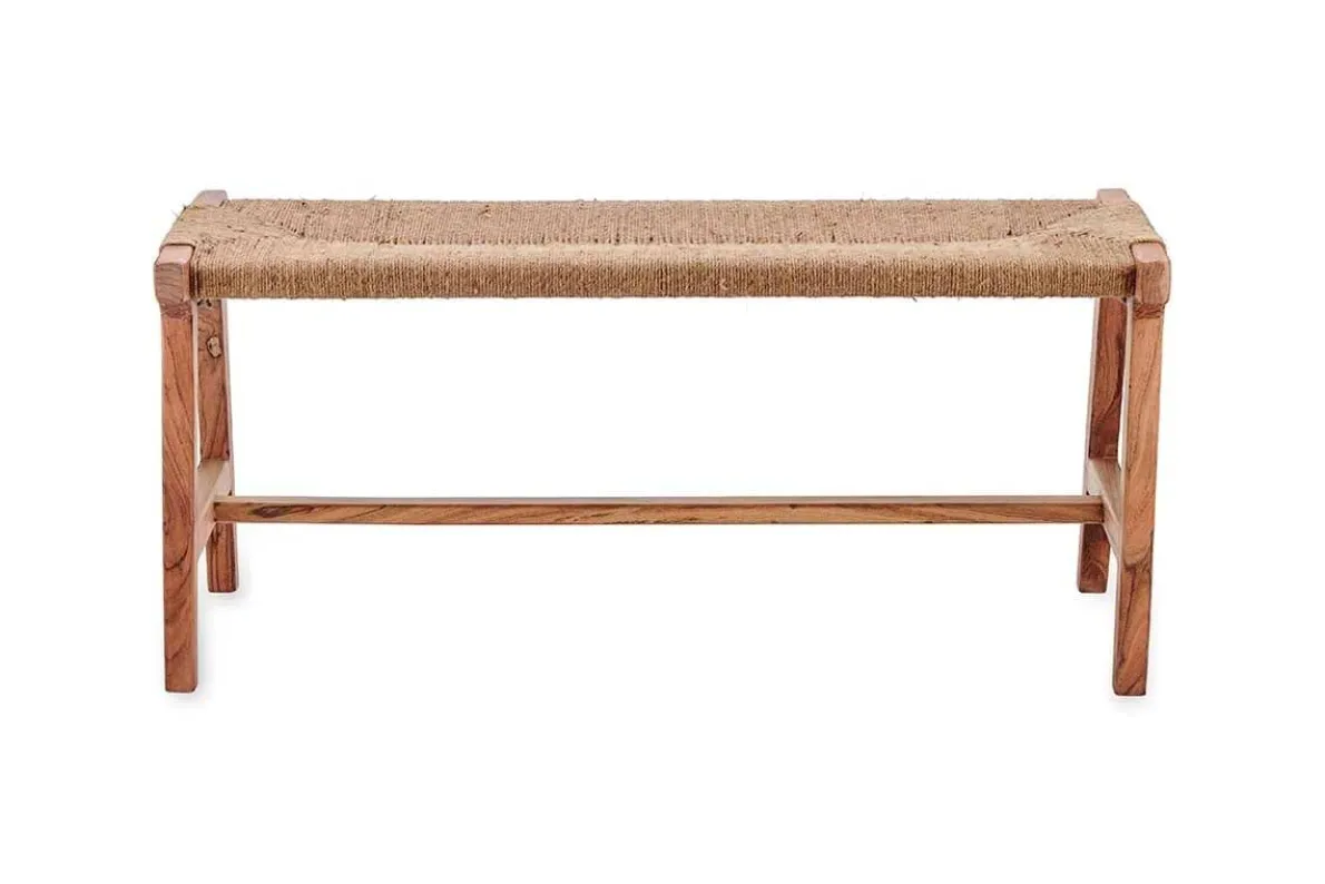 The frame of our Amhara bench is crafted from acacia wood, which has a warm natural grain. The woven jute seat follows a traditional Indian pattern and adds a softness to the bench’s aesthetic. This bench would sit well at the foot of the bed or as a place to put on shoes in a hallway. Its natural textures will make it a calming and tactile addition to your home.