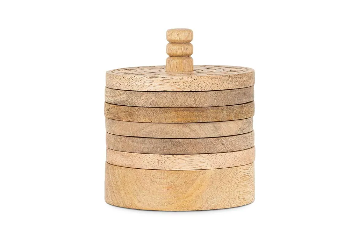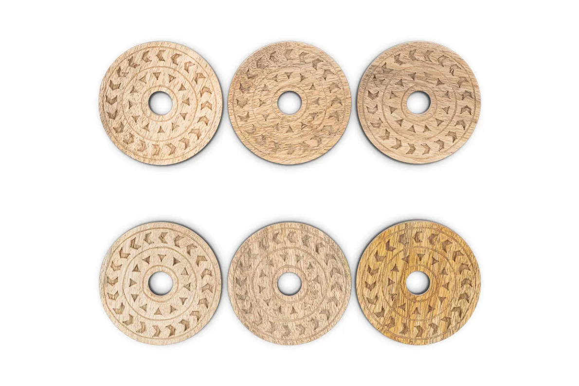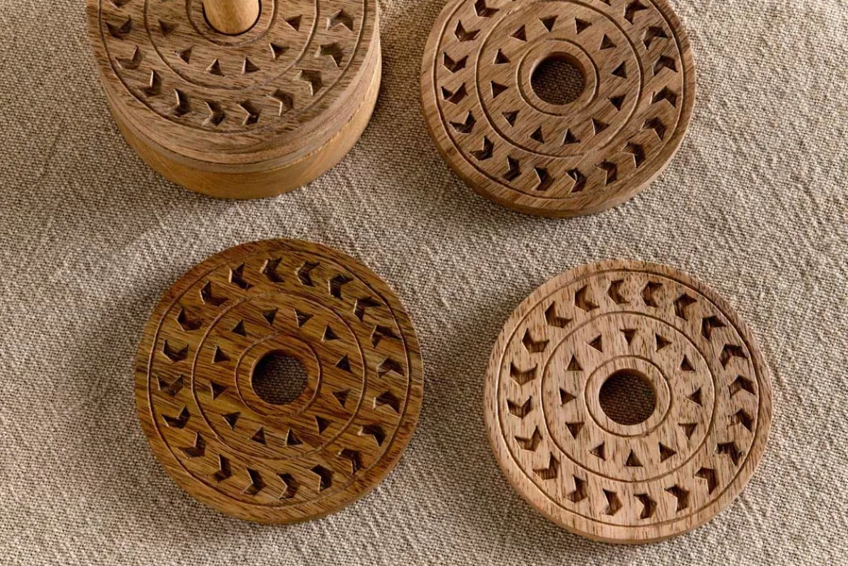 This beautiful set of 6 Anali mango wood coasters are etched with simple concentric circles that reveal the paler grain beneath to create a striking contrast between the natural tones of the raw wood. Each coaster has a central hole, designed to sit neatly on a holder for easy storage when not in use, creating an elegant silhouette at the same time.