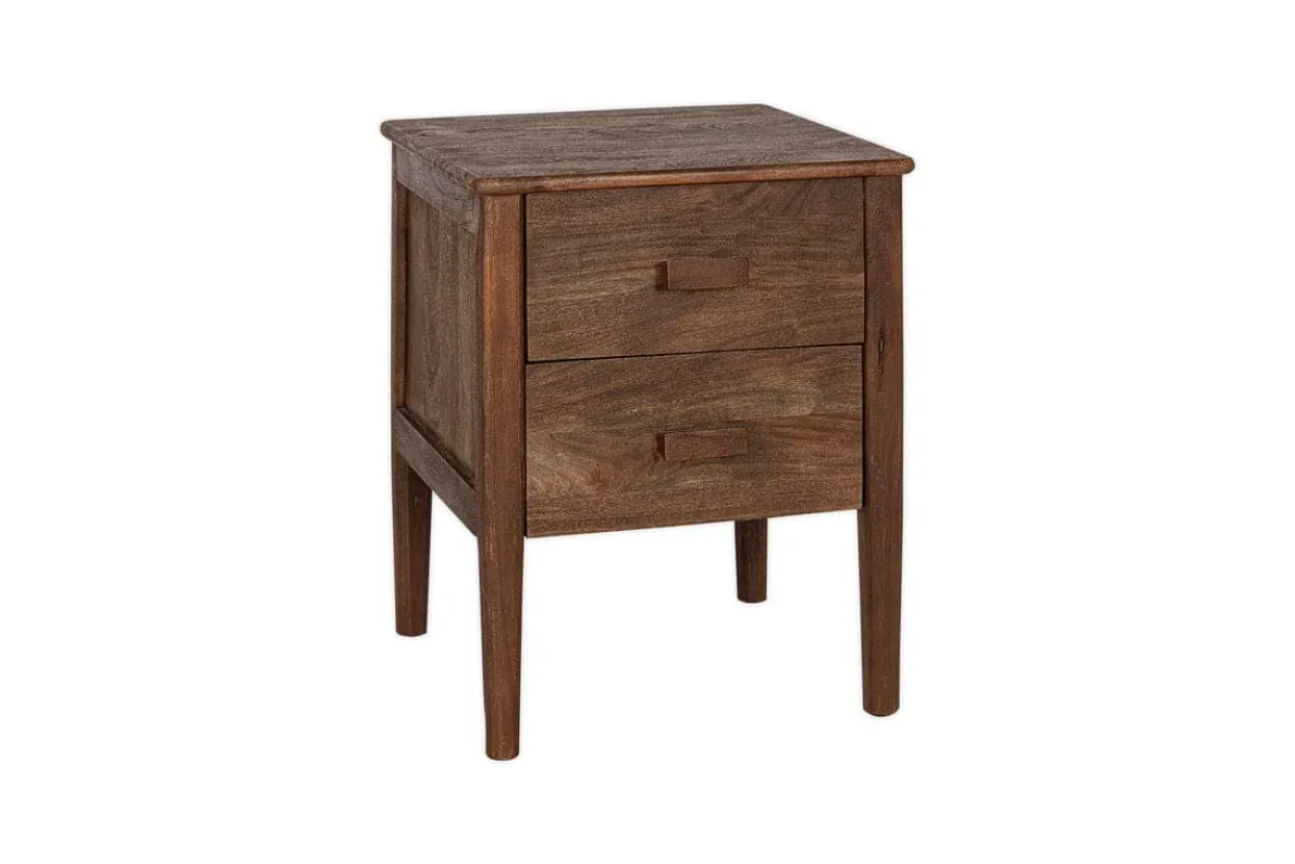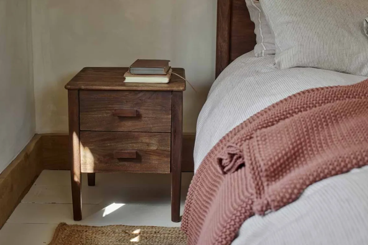 A refined extension of our bestselling Anbu collection, this bedside table is crafted from solid acacia wood with a rich walnut finish. The gently curved frame brings a soft, organic feel, while two drawers offer convenient storage for nighttime essentials. Elegant and functional, it pairs beautifully with the matching Anbu bed and chest of drawers for a cohesive bedroom look.