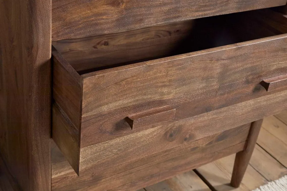 A refined addition to our bestselling Anbu collection, this chest of drawers is crafted from solid acacia wood with a rich walnut finish. The gently curved frame gives it an organic, sculptural feel, while three generously sized drawers offer practical storage. Its slim, vertical profile makes it ideal for bedrooms or smaller spaces, combining elegance with everyday functionality.