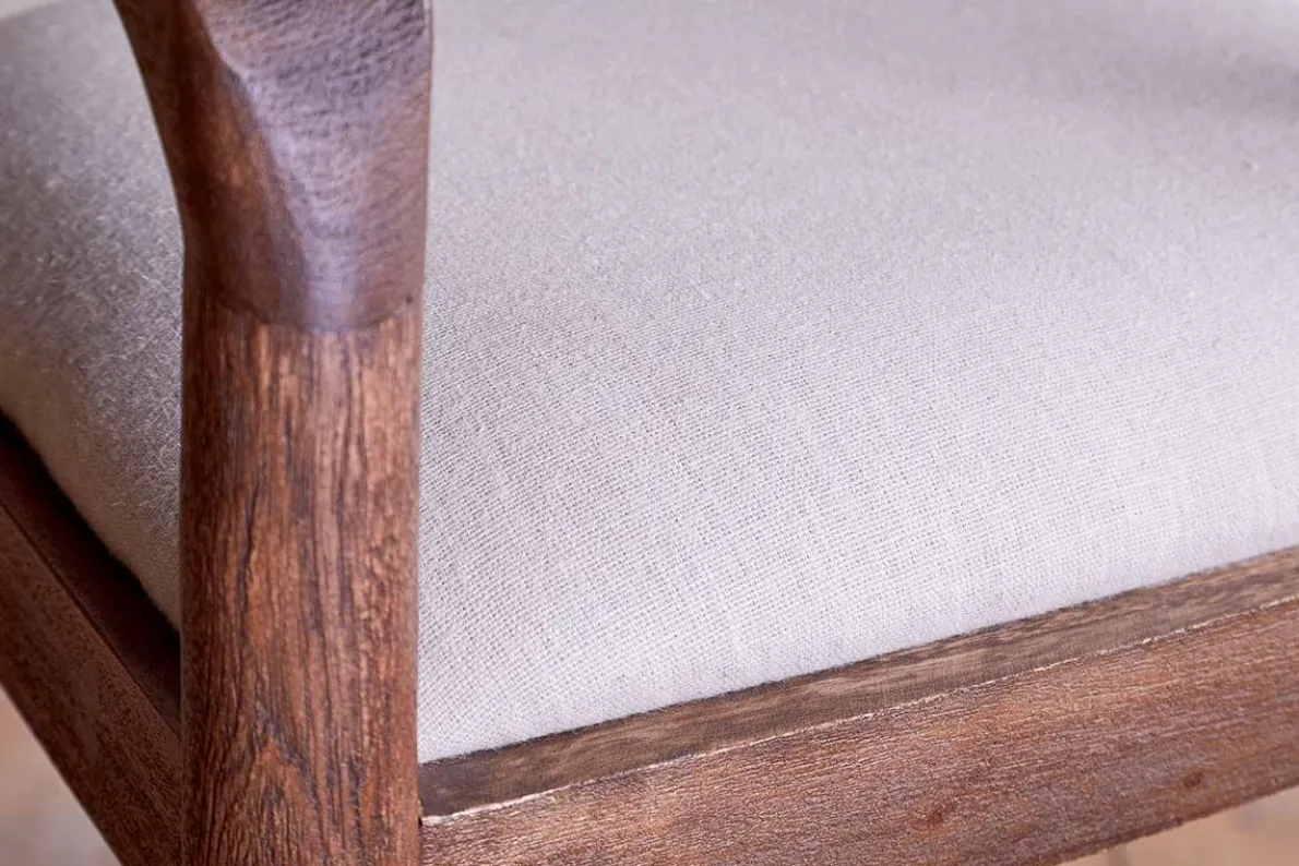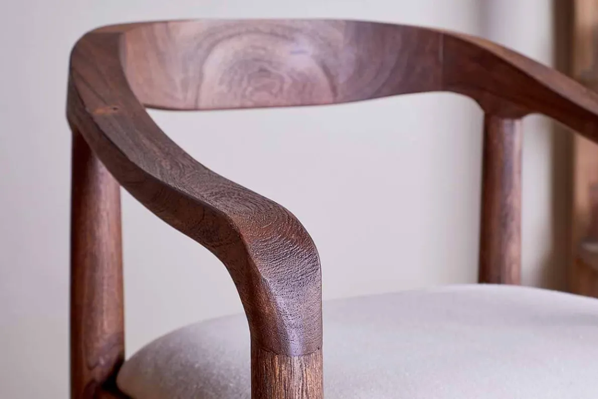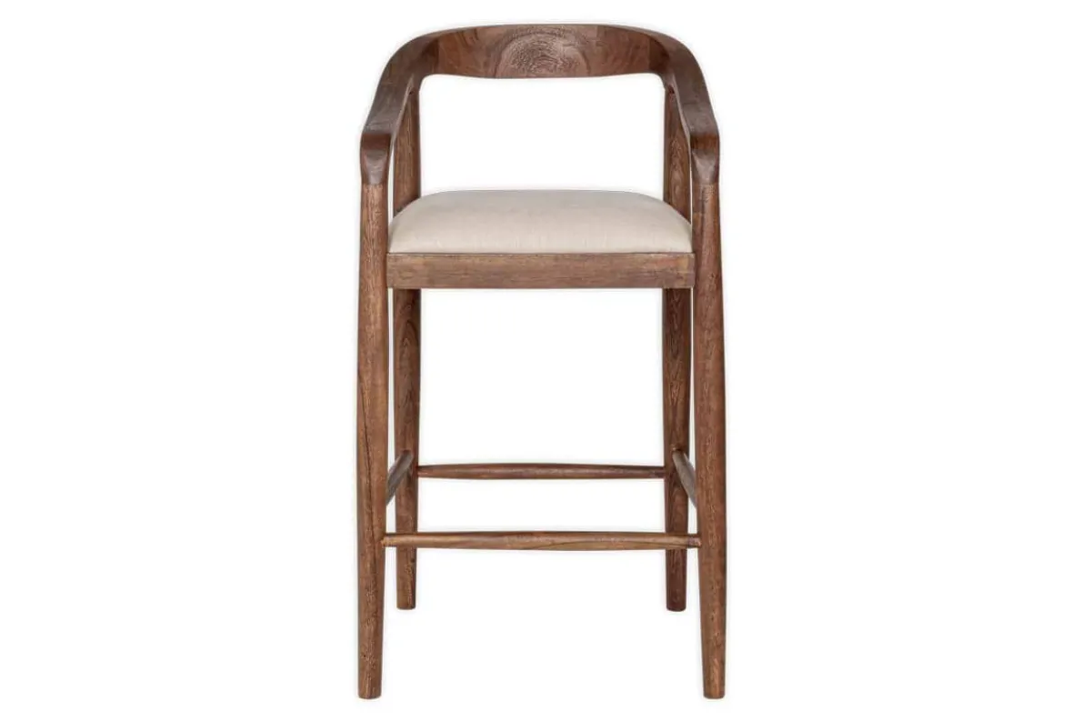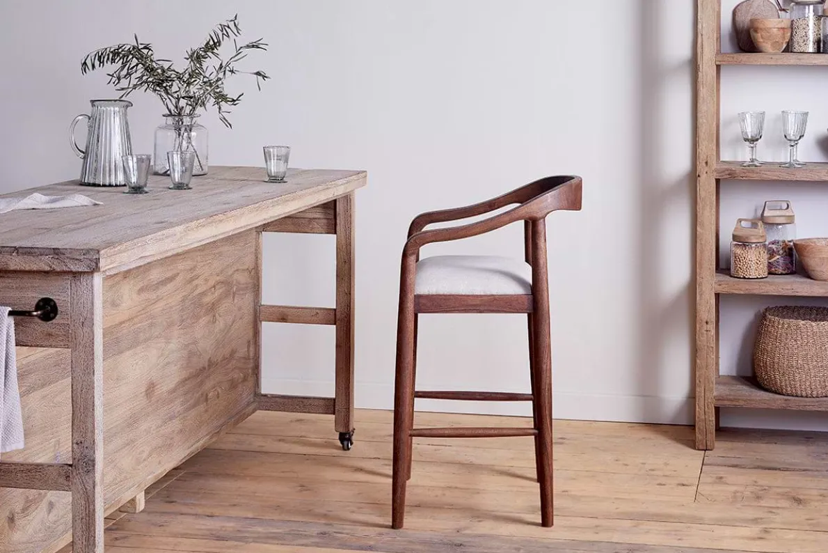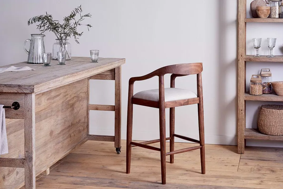 We’ve added an elegantly upholstered counter chair to our classic and timeless Anbu collection. Hand carved from solid acacia wood with a deep walnut finish and natural, textured linen seat, the organic curve of the frame and stark simplicity of the legs and footrest have an effortless design appeal that look beautiful around a kitchen counter or bar area. Part of our growing Anbu collection, this design is also available in a contrasting mango wood.