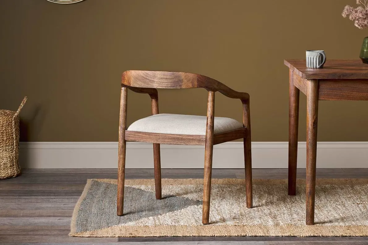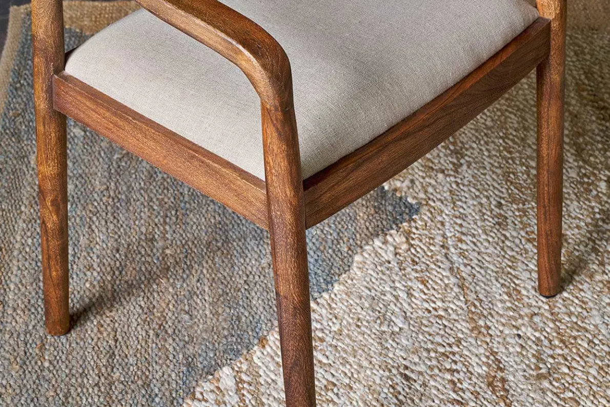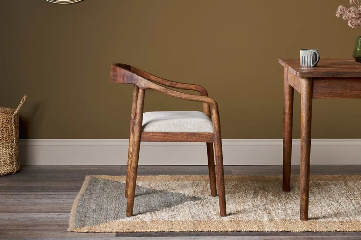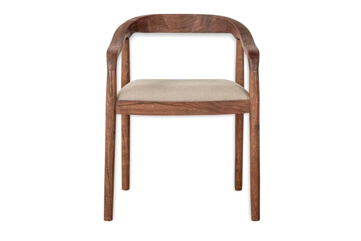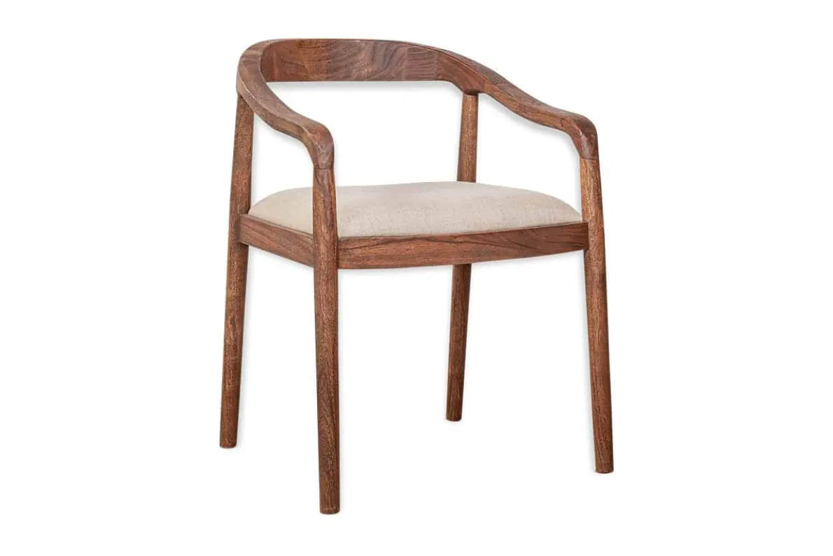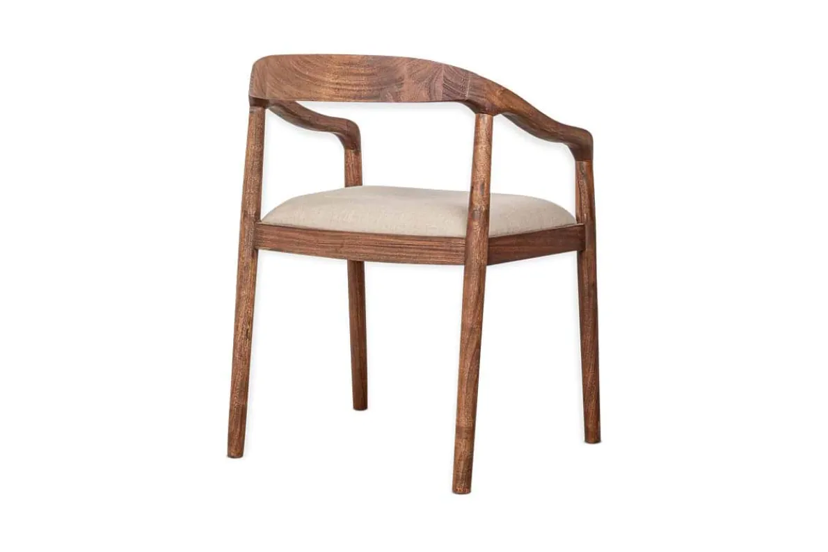 Classic and timeless, the upholstered Anbu dining chair is made from solid Acacia wood with a deep walnut finish and natural, textured linen seat. The organic curve of the frame and stark simplicity of the legs have an effortless design appeal that would look beautiful as a set around a dining table, individually at a desk or in a corner of a living space. Part of the Anbu collection.