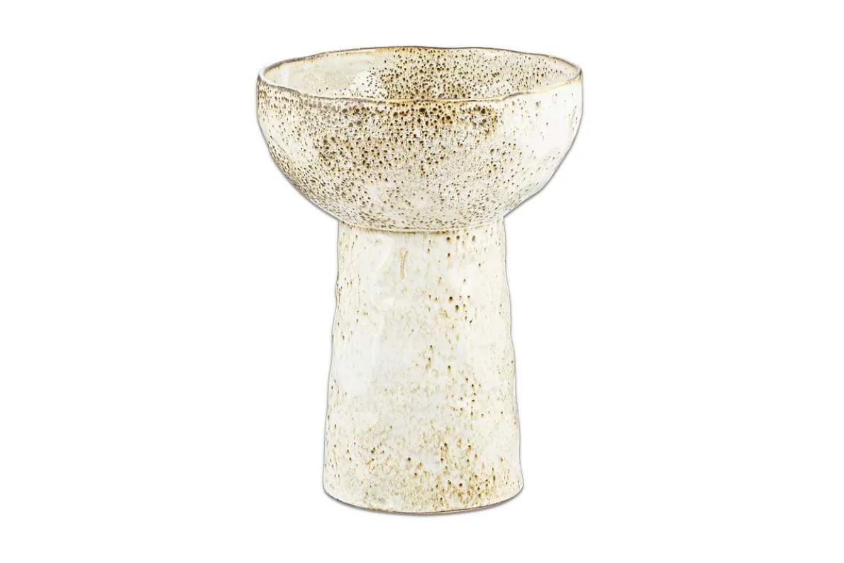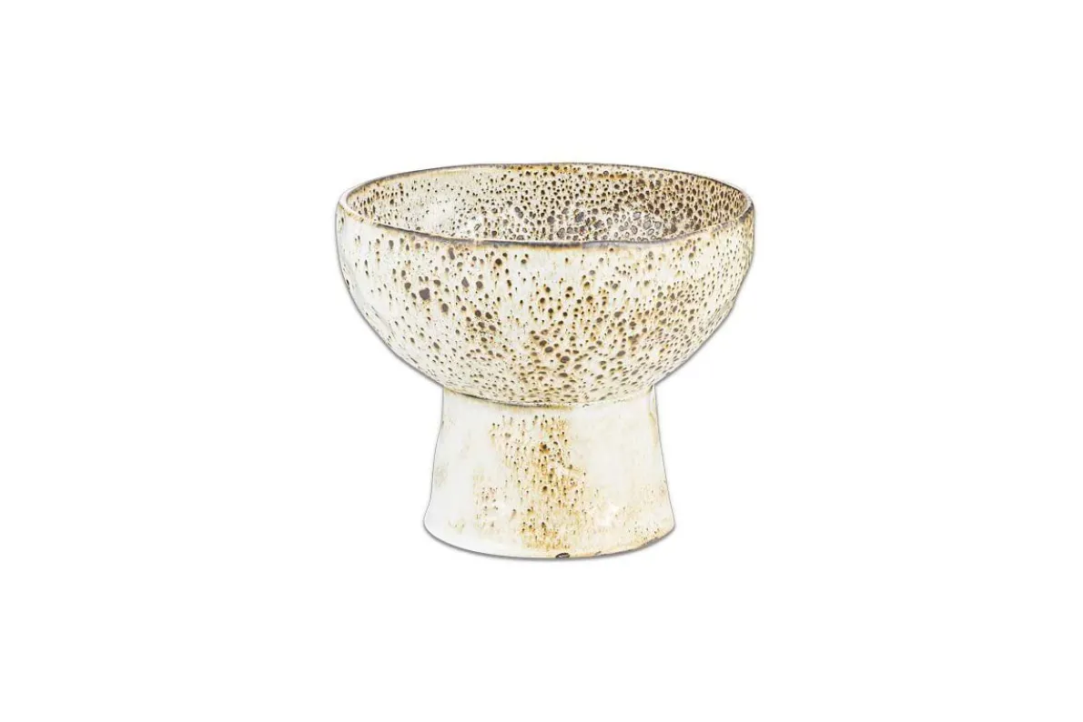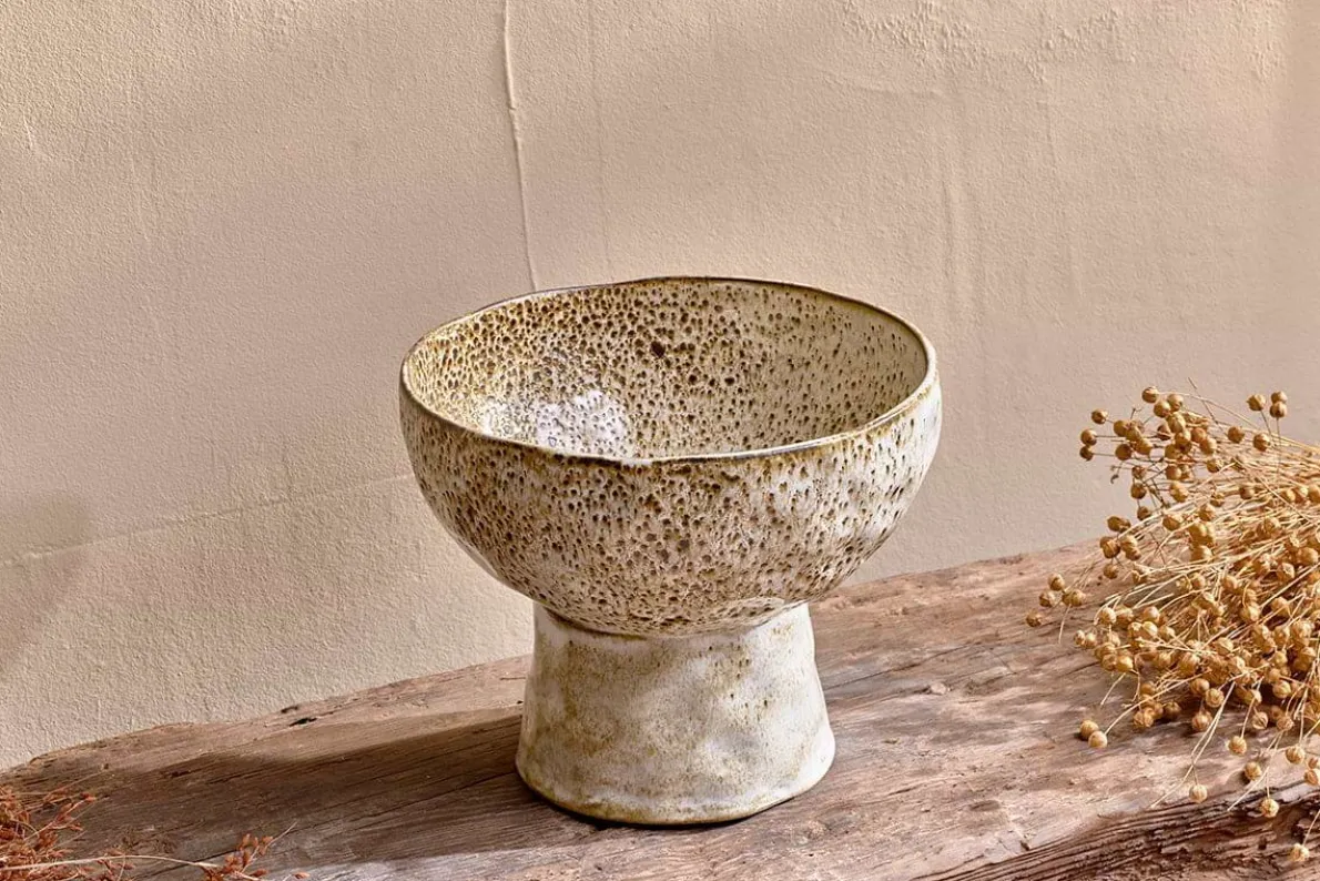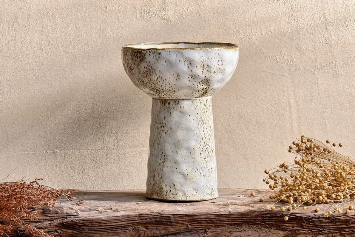 Bring a fresh spring look and feel to your home with these Anjuna standing bowls. Their appealing organic shape marries perfectly with the irregular and varied finish of the reactive glaze. The soft, speckled brown undertones subtly blend with the appealing off-white glaze to stunning effect. The raised stand elevates the bowl to become a showpiece, be it as a standalone decorative bowl or for more practical use.
