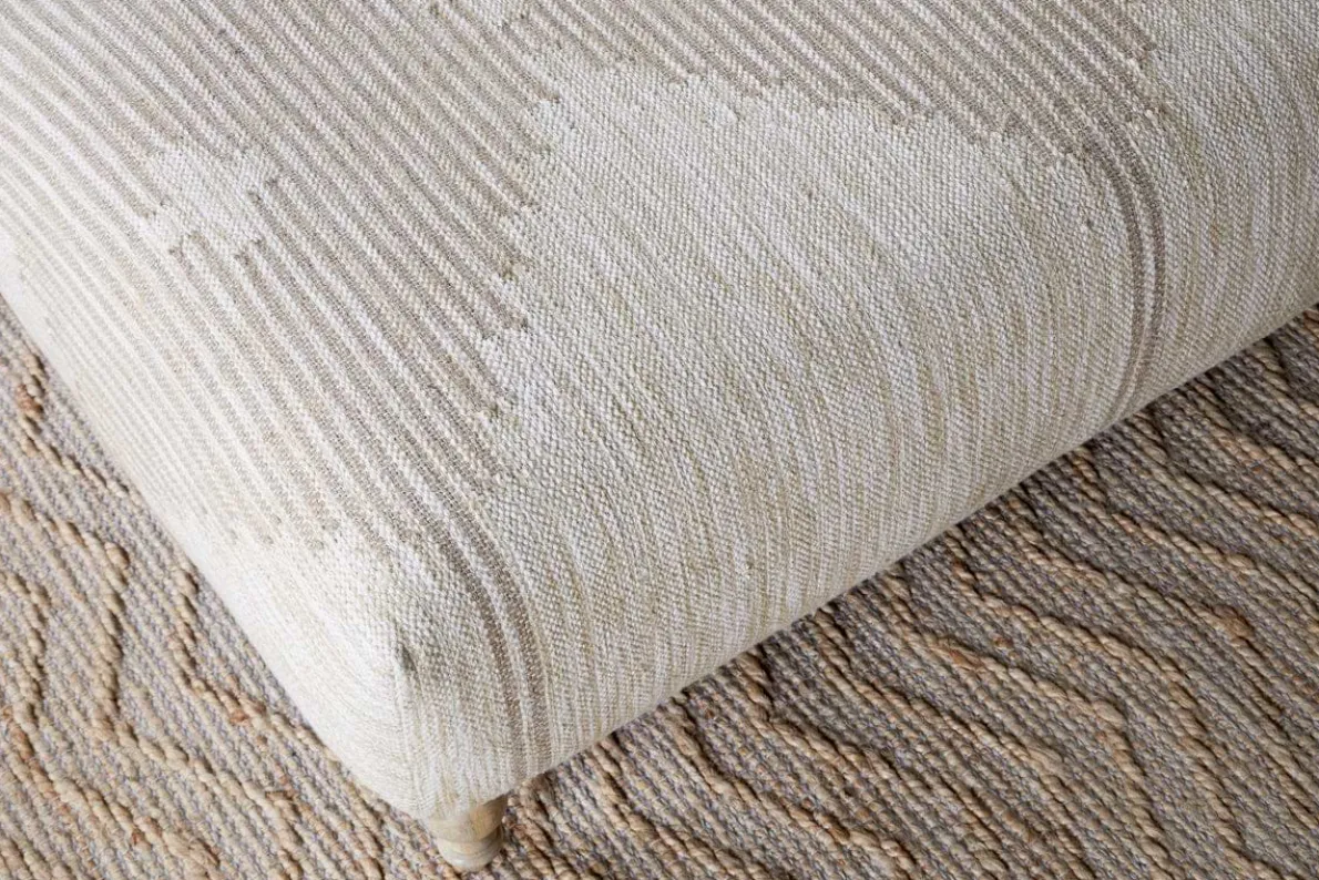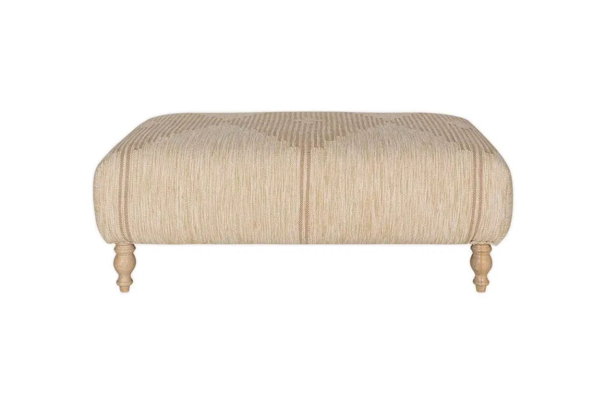 Upholstered in a cotton and jute blend with a traditional kilim design, this ottoman adds soft texture and pattern to any space. The muted natural tones bring a calming presence, while the cushioned top offers a comfortable spot to rest your feet or use as an occasional seat. Finished with sturdy wooden legs, it-s a versatile and stylish accent for any living room or snug.