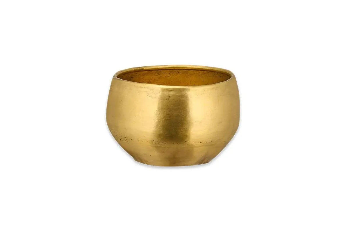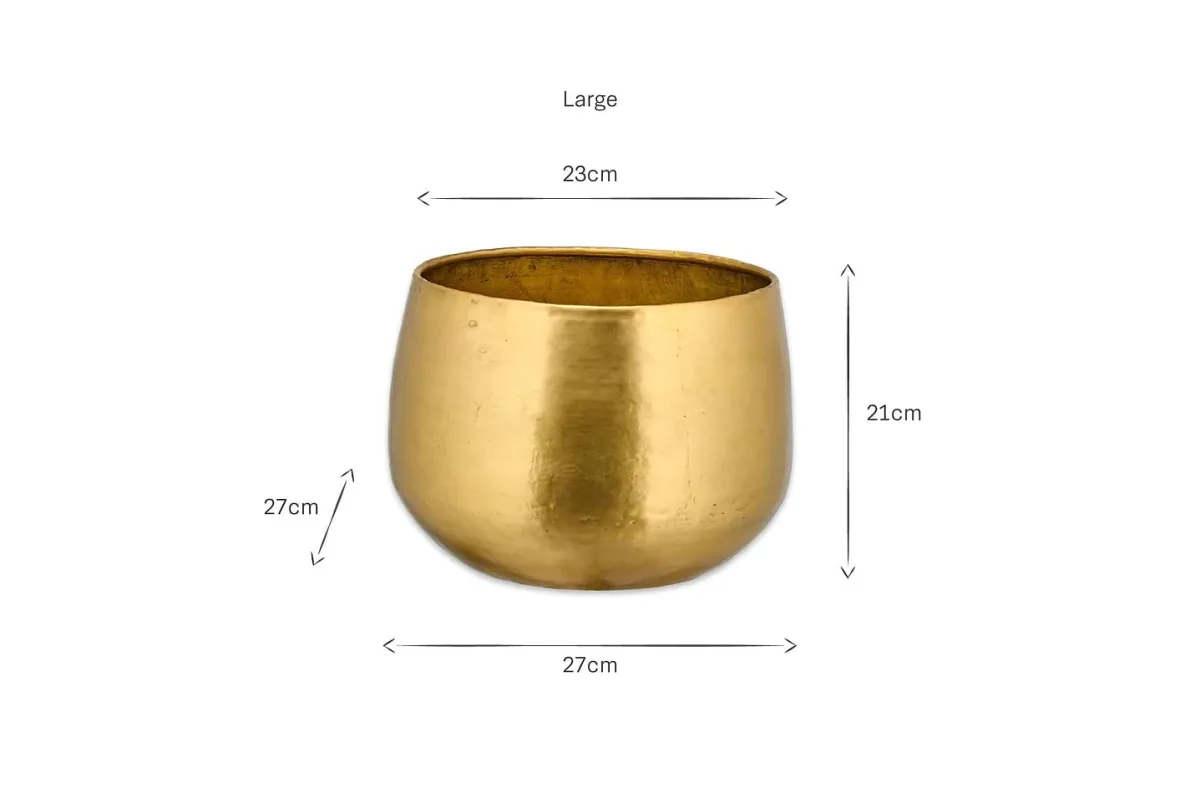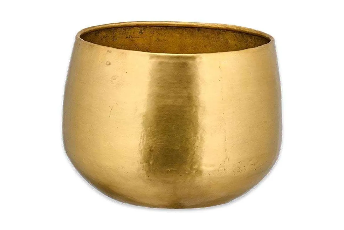 This stylish Atsu brass planter has a smooth finish and curved shape, with the golden brass hues adding to its sophisticated look. To create a eye-catching display style in trios with a mix of sizes and varieties of house plant.