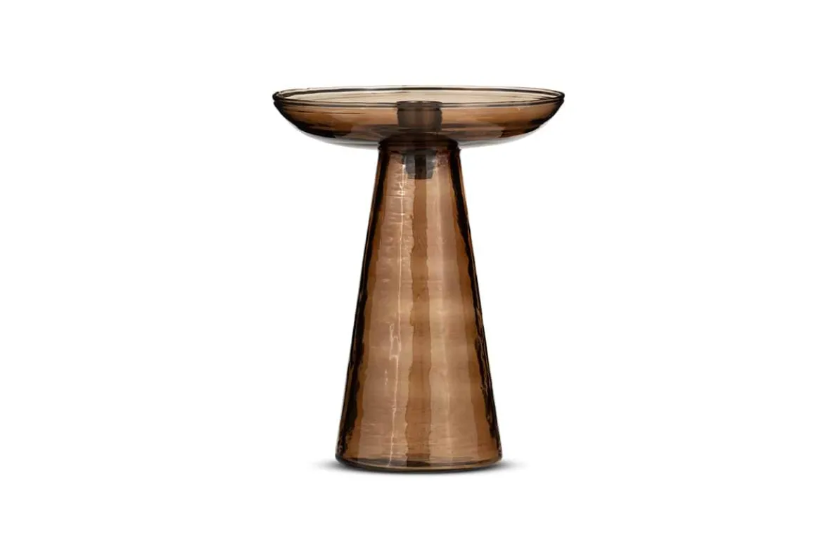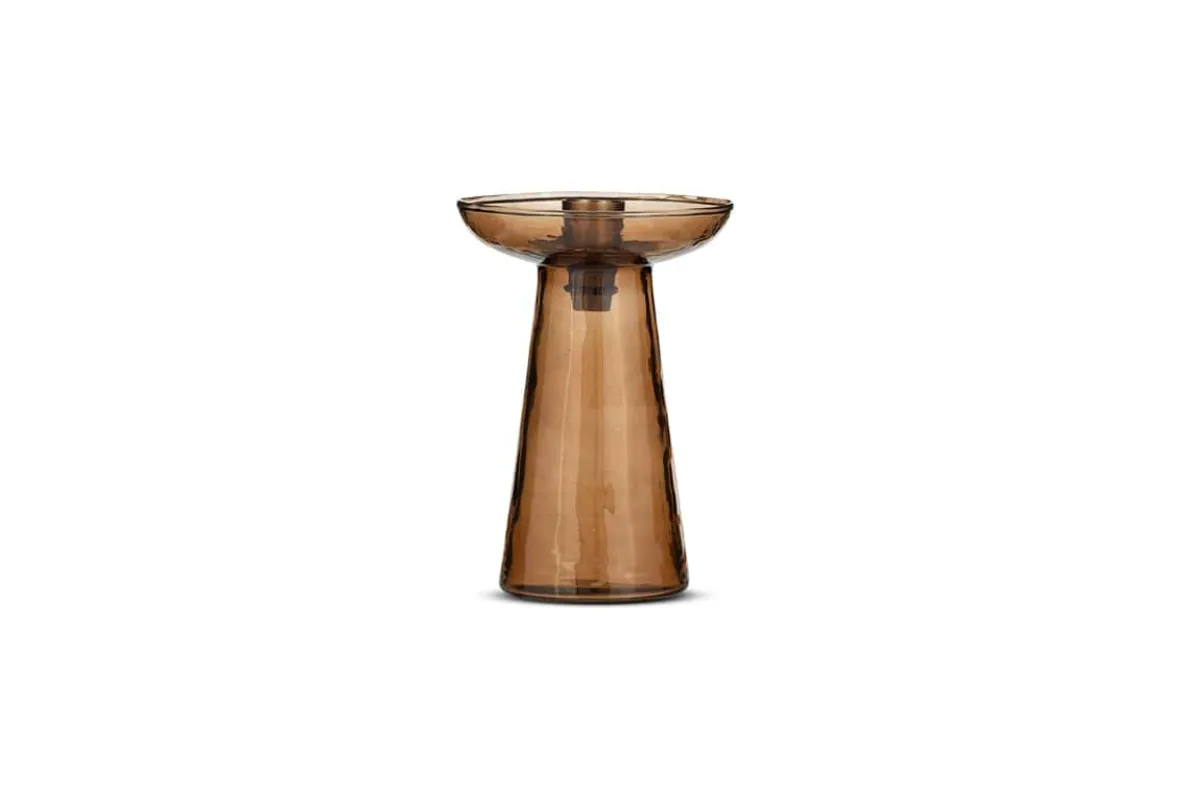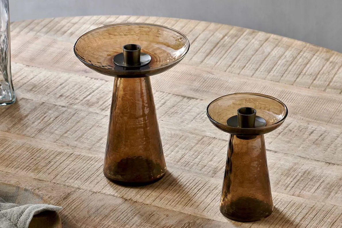 Our enchanting Avyn smoke amber glass candle holder is a simple yet sophisticated piece that is as sculptural as it is functional. The appealing tones of the amber coloured glass flatter the smooth and elegant contours and tapered base of the holder. Designed to hold a dining candle, style in pairs for a traditional dining table setting or mixed sizes for a more creative display. Each glass candle holder is crafted from recycled glass. Also available in a smaller size. Style with our pillar candles.