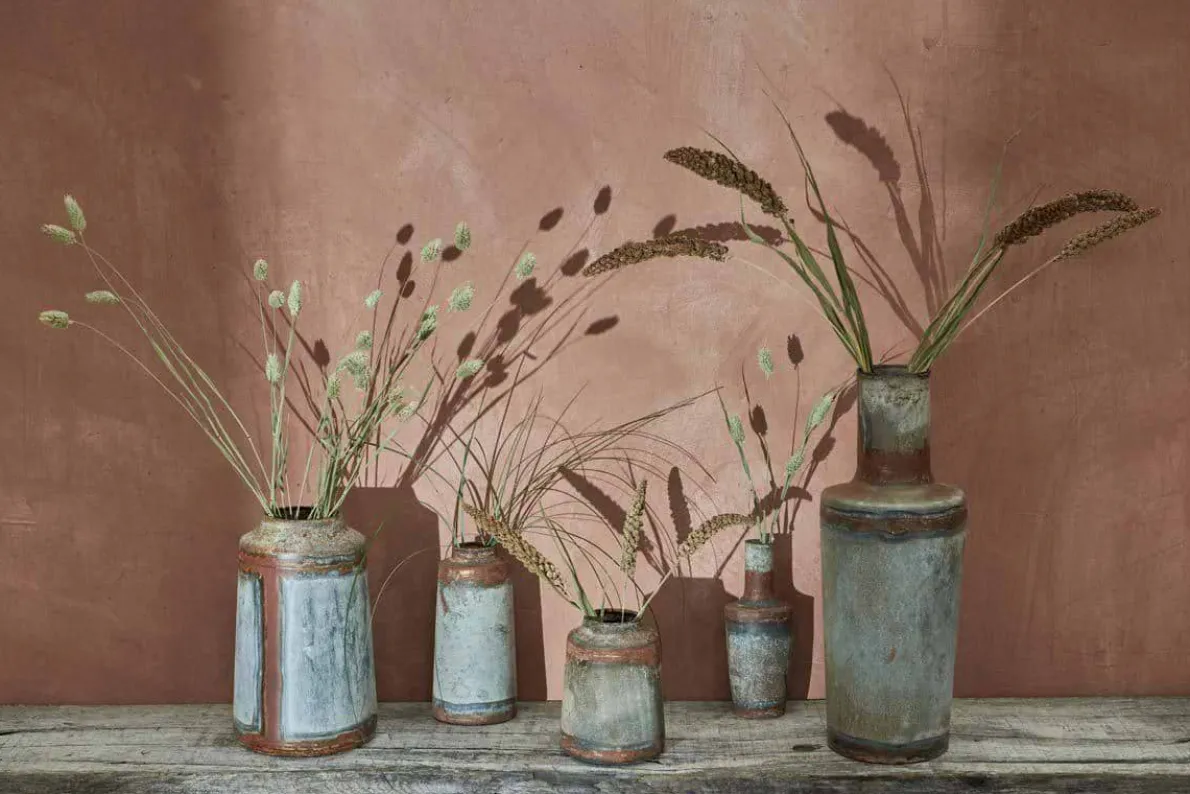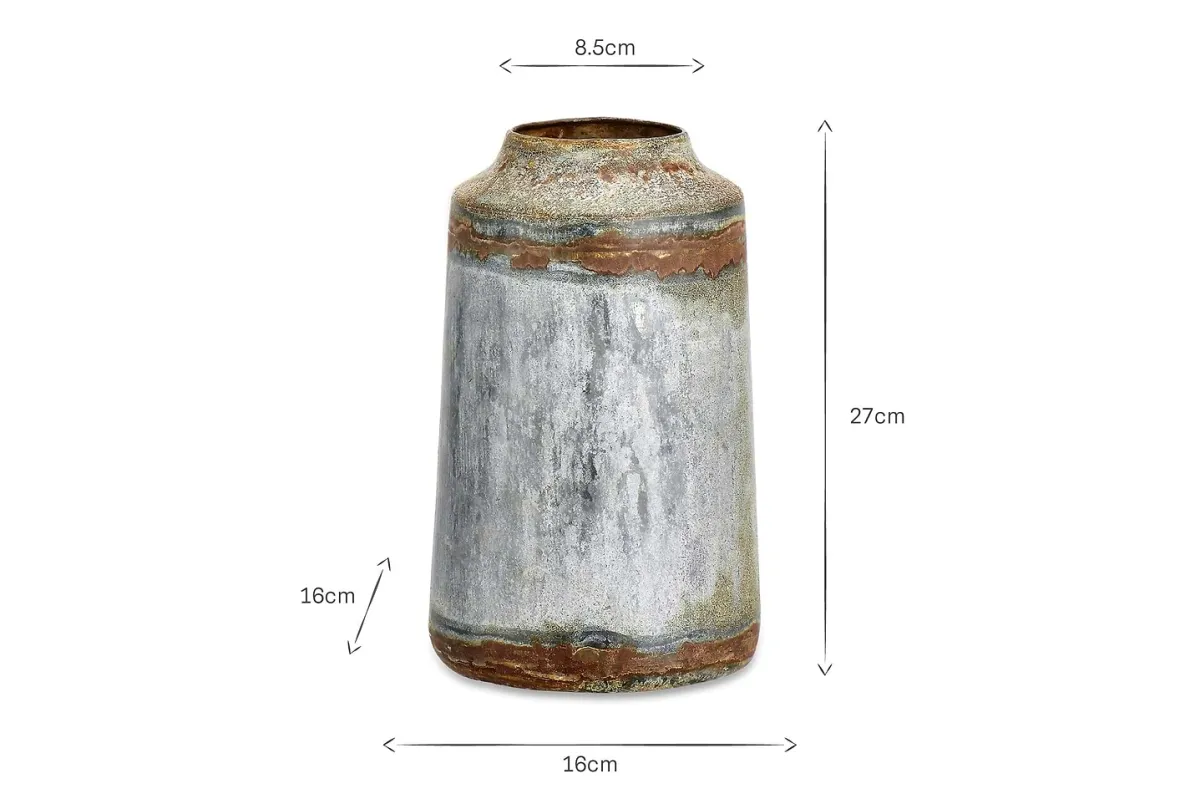 The aged – zinc patina of these rustic vases, gives them an imperfect aesthetic and creates an ideal back drop for flowers and foliage.