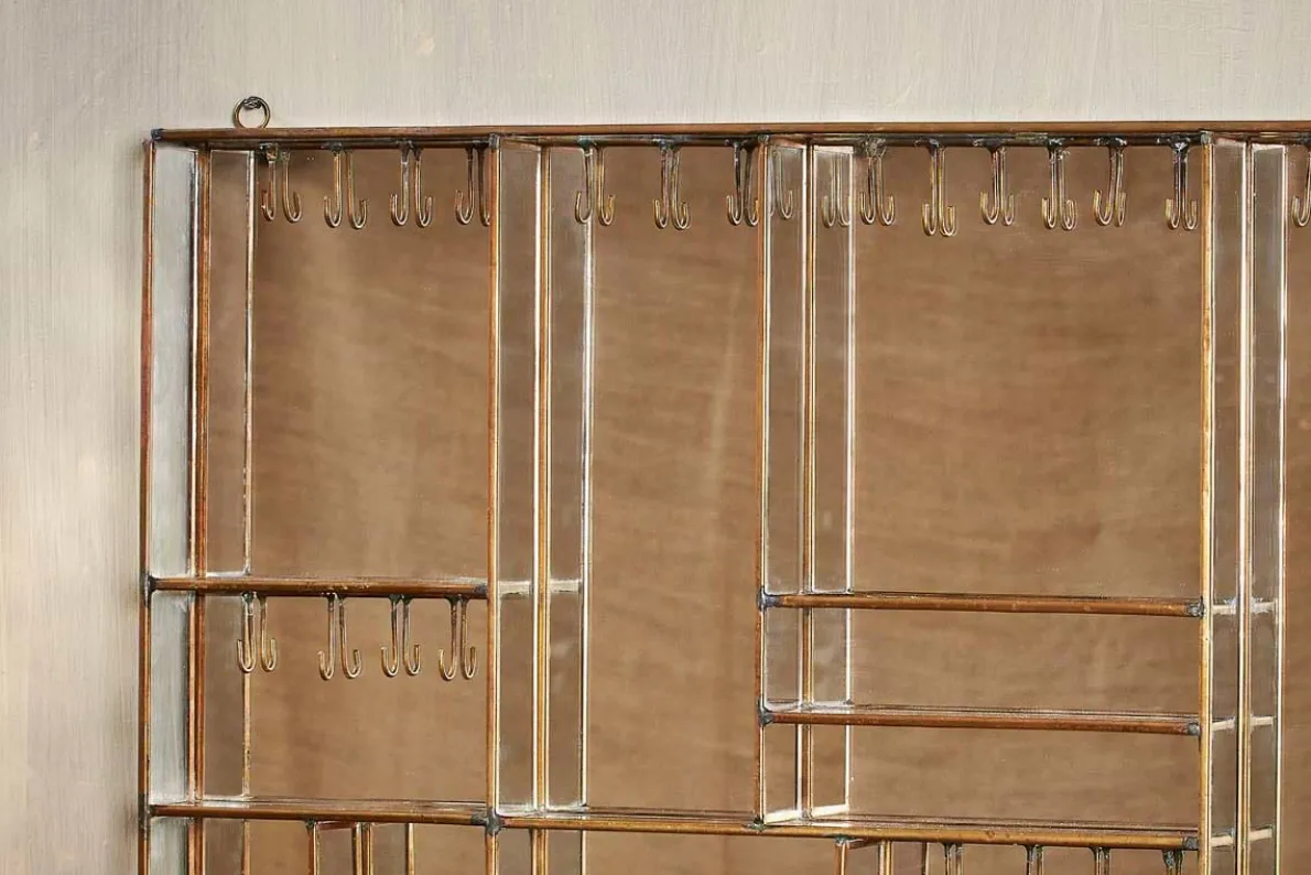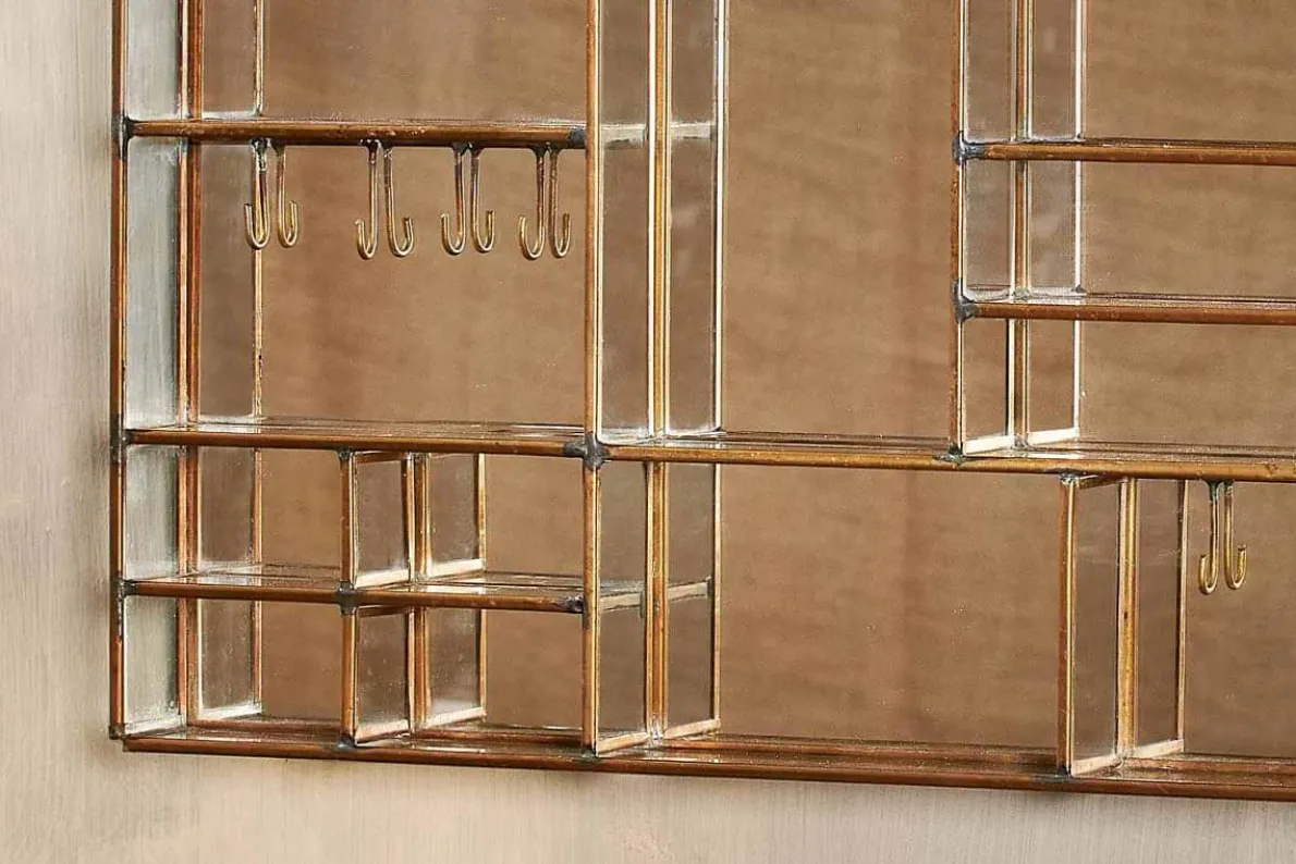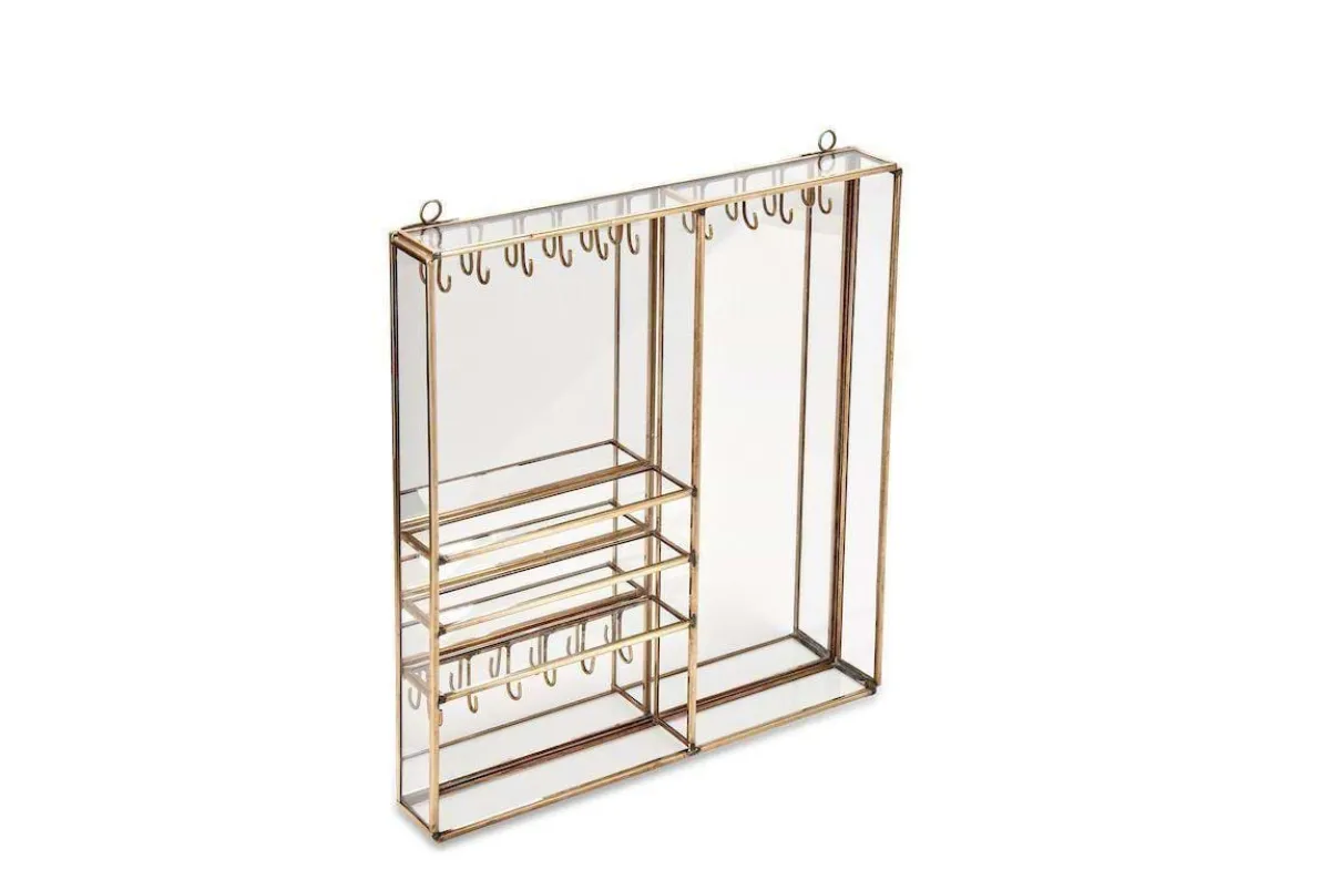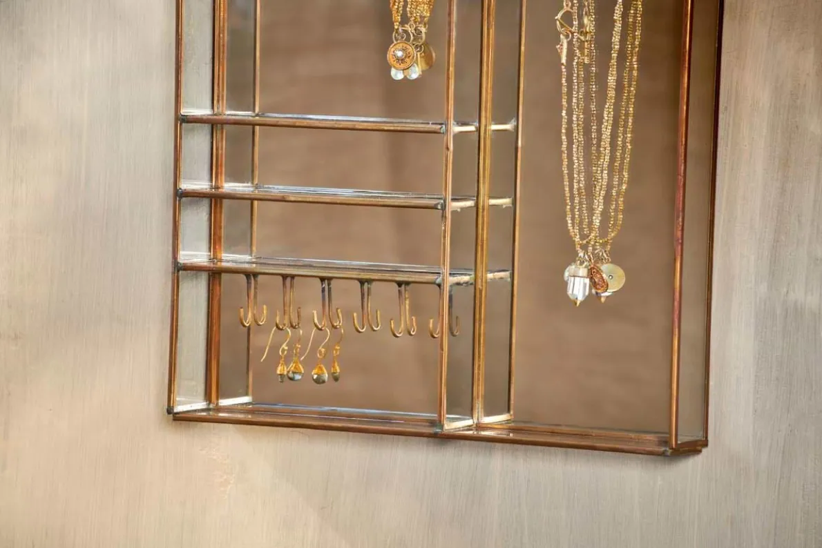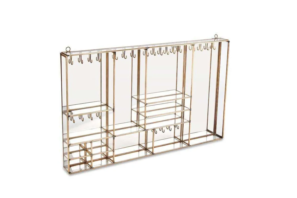 Design your own elegant storage space in a bedroom or bathroom with our stylish Bequai wall hung jewellery box. The golden hues of the brass frame and mirror base enhance the variety of compartments and rows of hooks. Aside from the aesthetically pleasing essence of this piece you’ll solve the problem of knotted necklace chains and missing earrings, in this elegant jewellery storage cabinet.
