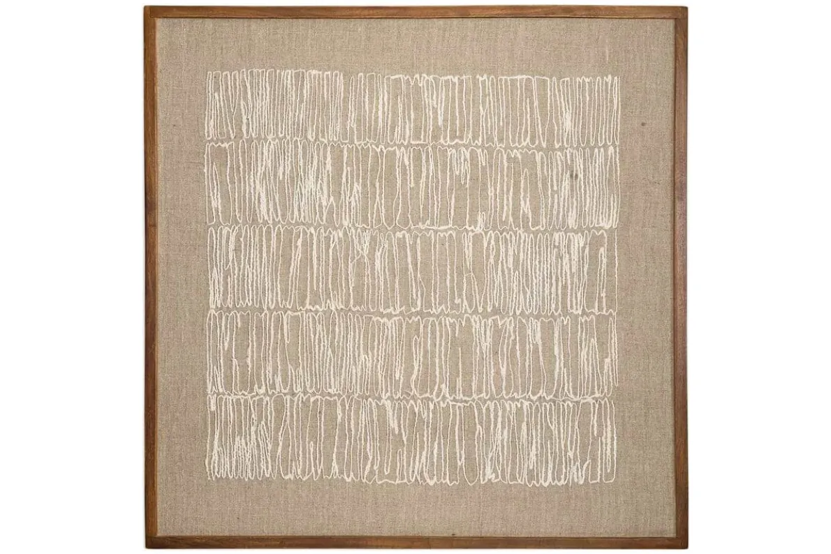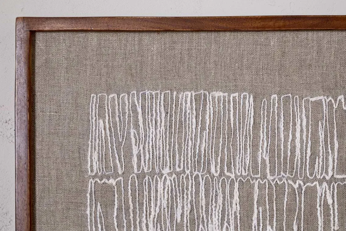 This hand-stitched wall art draws inspiration from traditional Indian Brahmic script, reinterpreted in a creative, textural design. The calming palette of walnut, olive grey, and soft white adds a quiet, grounding presence to any living space. Framed in sustainable mango wood, it balances thoughtful craftsmanship with natural materials. Pairs beautifully with our Samaya wall art for a harmonious display.
