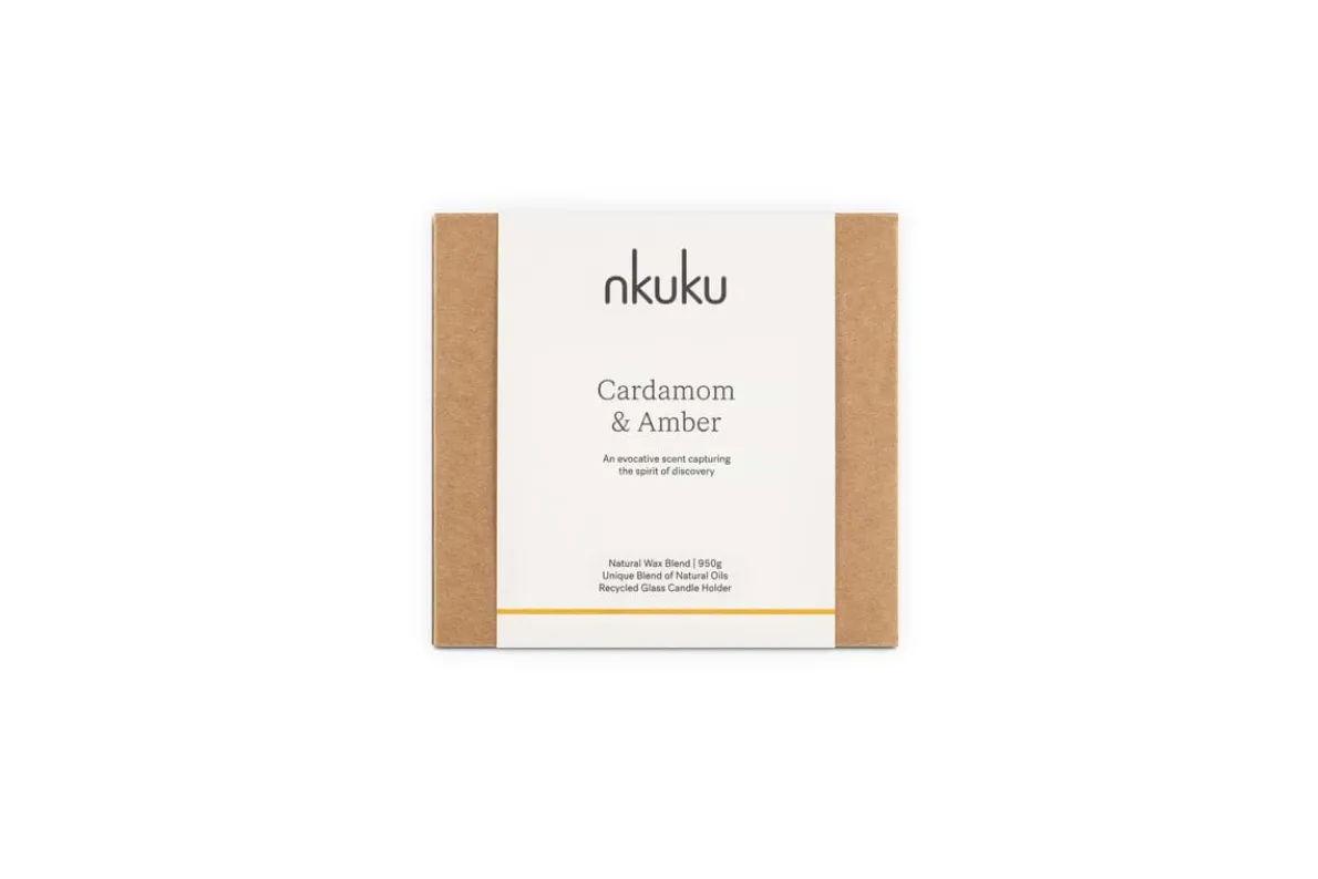 This scented candle is made in the UK by a family-run business, using a bespoke fragrance created exclusively for Nkuku. An evocative scent with rich notes of sandalwood, earthy cedarwood, and warming amber, capturing the essence of distant travels and the spirit of discovery. The vessel is finished in one of Nkuku’s iconic textured styles and intended to be reused once the candle has burned through.