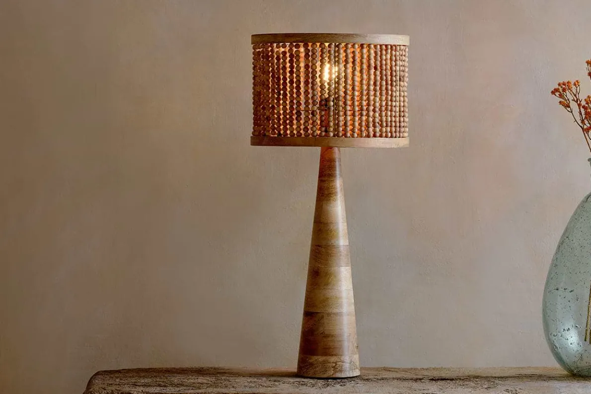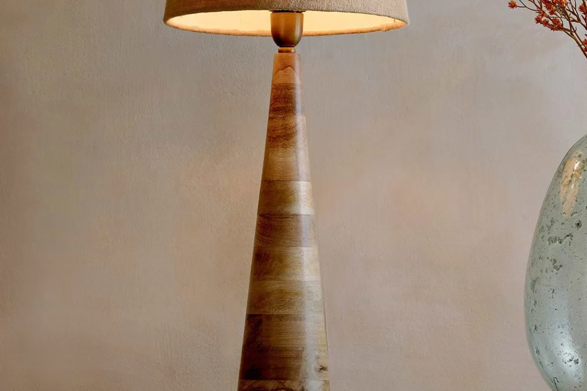 The elegant simplicity of our tapered Chameli mango wood makes it the perfect piece to add texture and interest to any living space. The beautiful variations that come from the natural grain of the wood add warmth to this tactile piece. Made from varying sized pieces of mango wood, each lamp has a unique and precious appearance. Perfect on a sideboard paired with Dia shade. Pictured with our medium sized Dia Jute Lampshade in Natural.