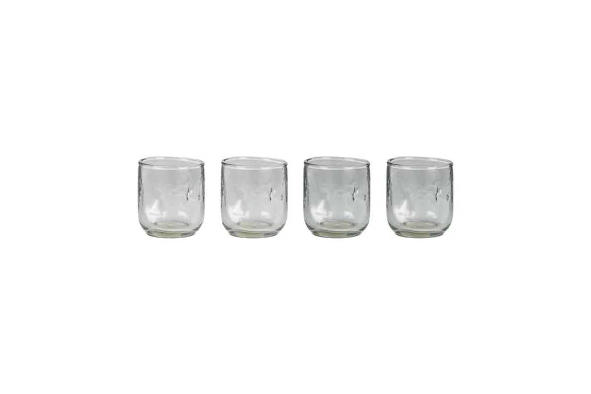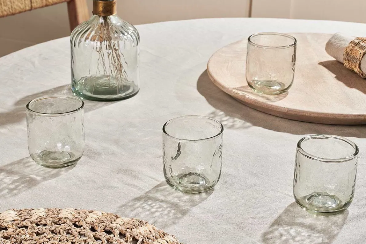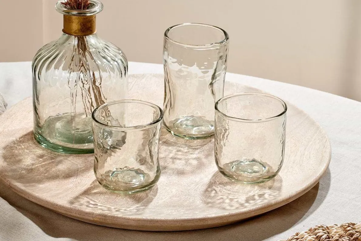The Chandani glass tumblers have an attractive organic shape. Each tumbler is handblown from recycled glass into this appealing irregular design. The glass maker uses traditional tools to create the glass, pinching the molten material to create a tactile hold point. The soft unregulated profile of the Chandani has a natural look and feel. The hammered glass adds a soft shimmer to the exterior. The thick lip of the glass has been rolled creating a soft surface that is pleasant to drink from. The Chandani feels playful and fresh and it demonstrates the qualities of the handmade process and the beauty of simplistic design.