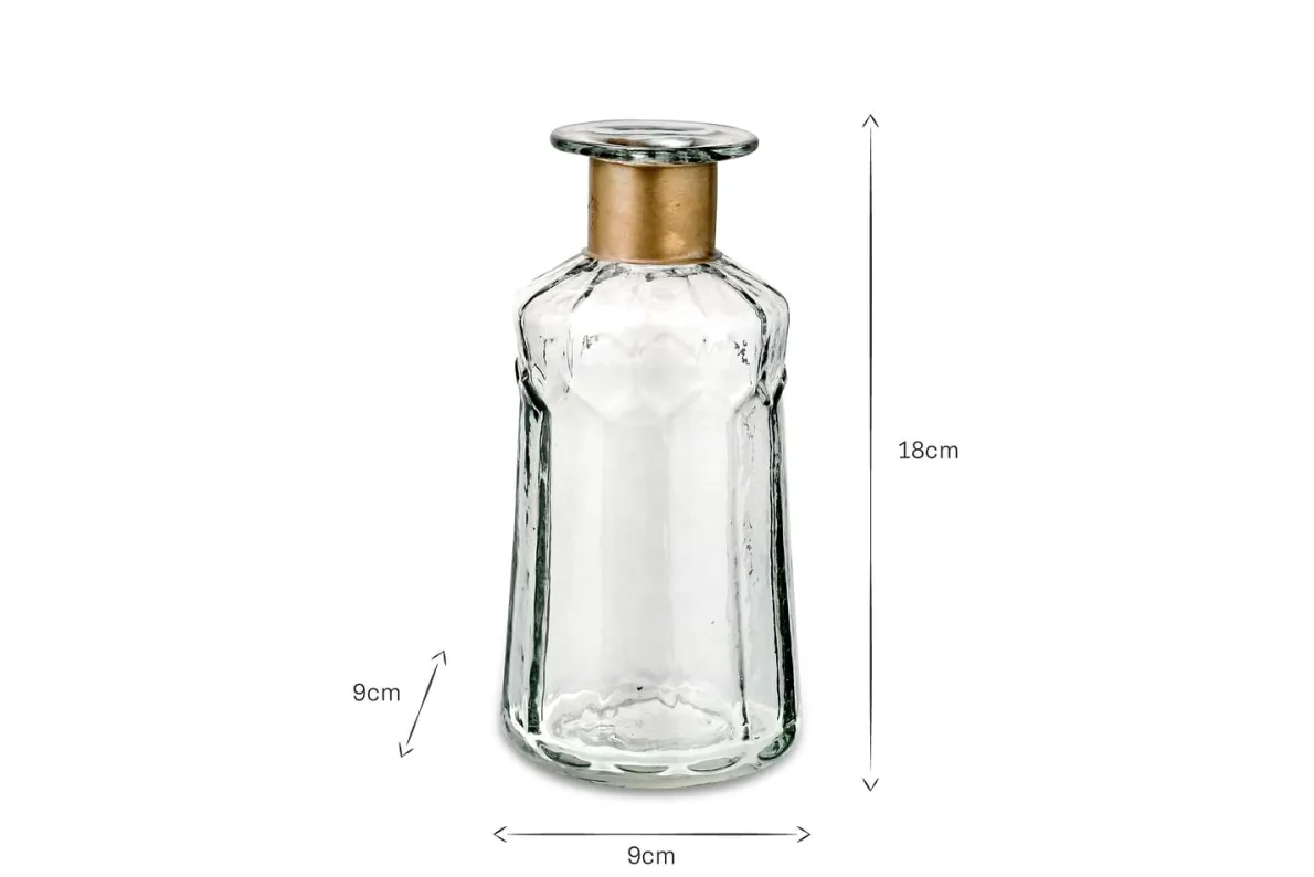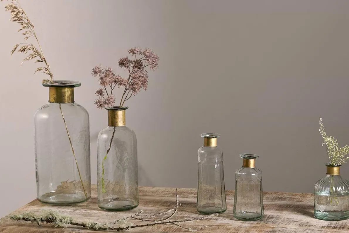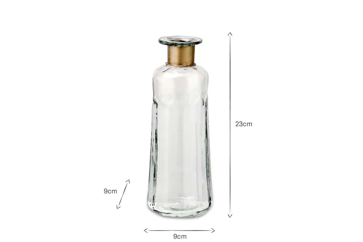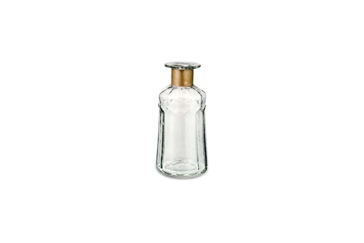 Our Chara bottles are full of sophisticated rustic charm; these artisan made pieces involve hammering the glass with traditional tools providing a subtle textured affect. The glass is skilfully blown through the brass ring creating this elegant shape. Solder marks are often evident on the brass as a result of this complex handmade process.