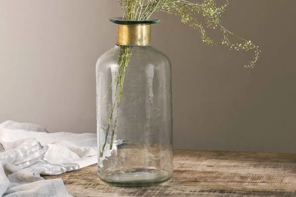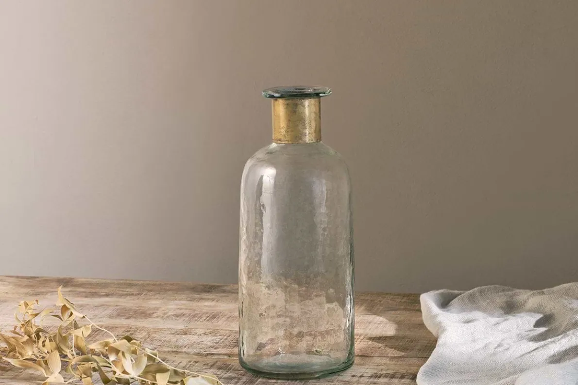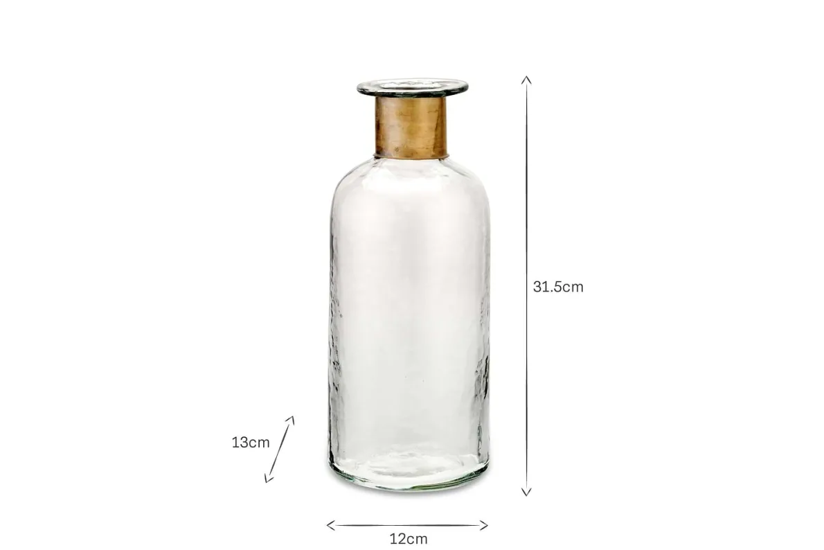 Our Chara bottles are full of sophisticated rustic charm; these artisan made pieces involve hammering the glass with traditional tools providing a subtle textured affect. The glass is skilfully blown through the brass ring creating this elegant shape. Solder marks are often evident on the brass as a result of this complex handmade process.