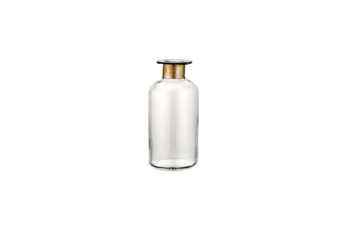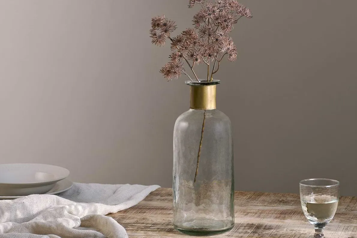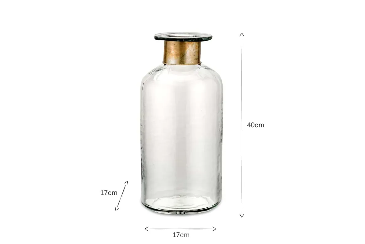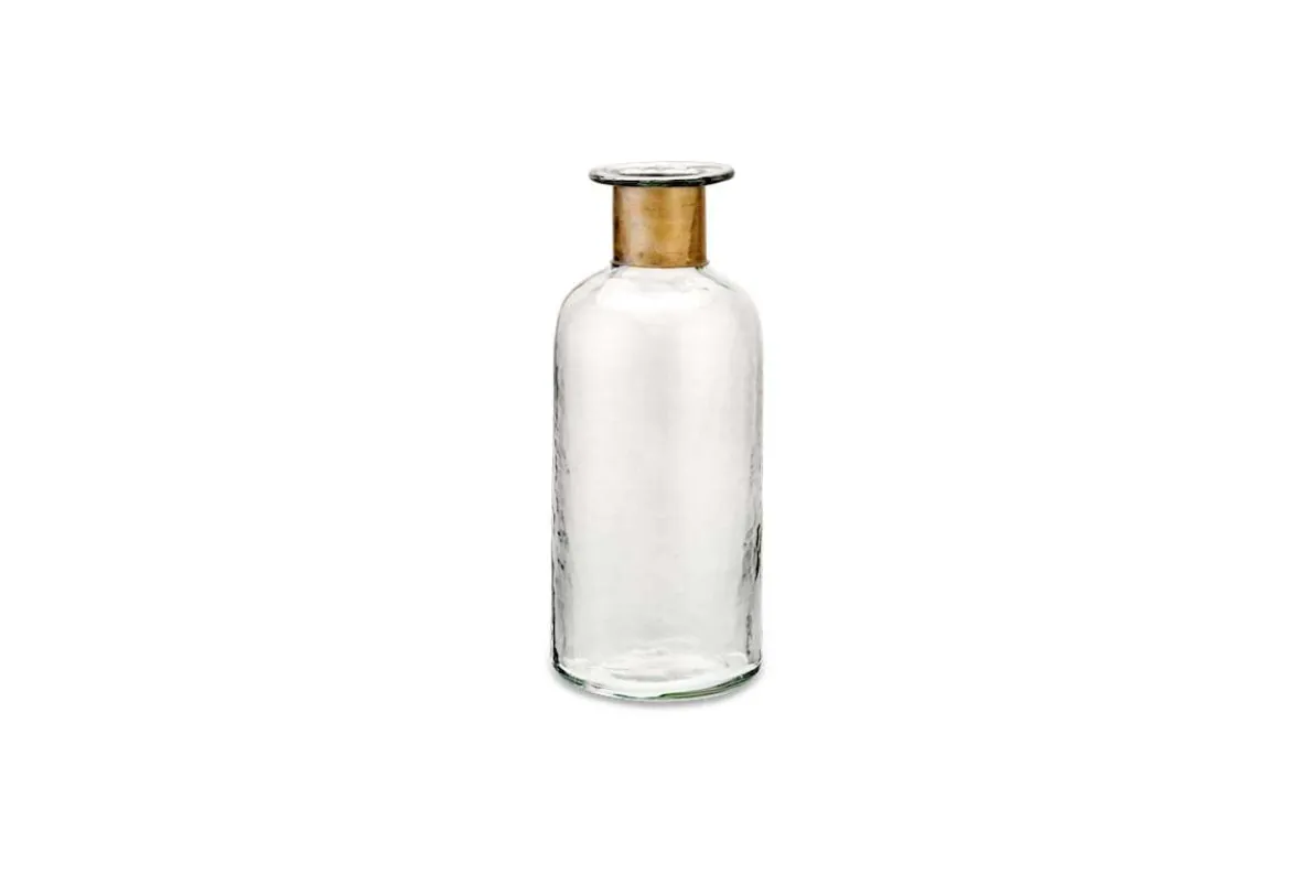 Our Chara bottles are full of sophisticated rustic charm; these artisan made pieces involve hammering the glass with traditional tools providing a subtle textured affect. The glass is skilfully blown through the brass ring creating this elegant shape. Solder marks are often evident on the brass as a result of this complex handmade process.