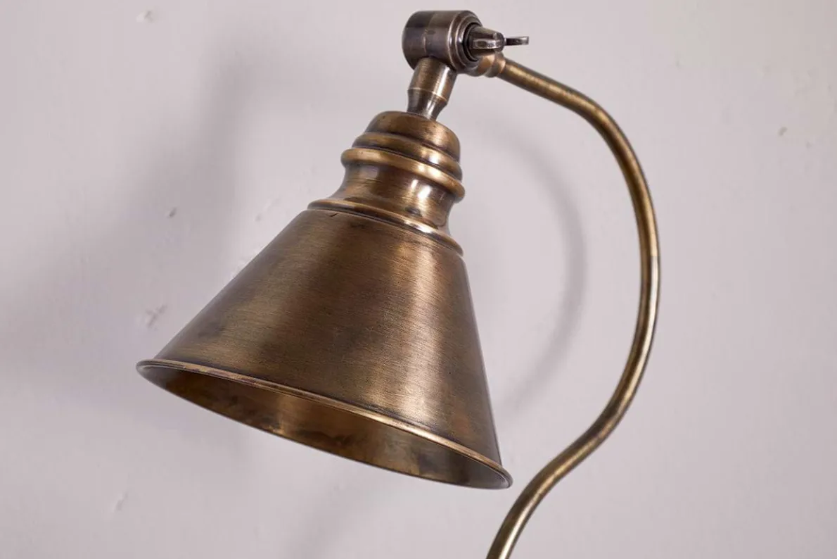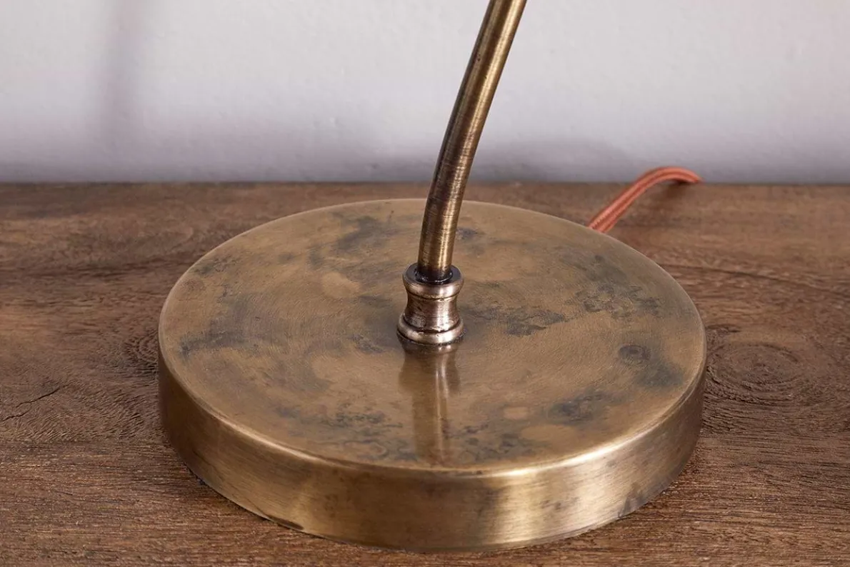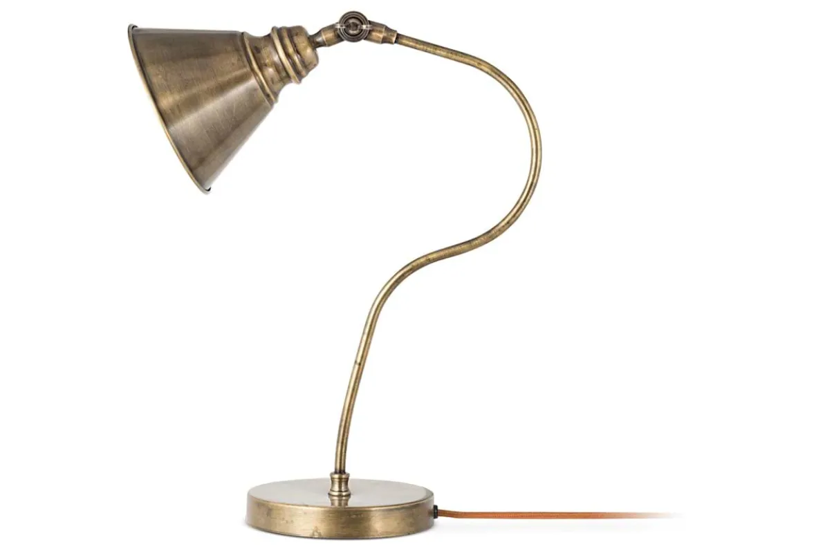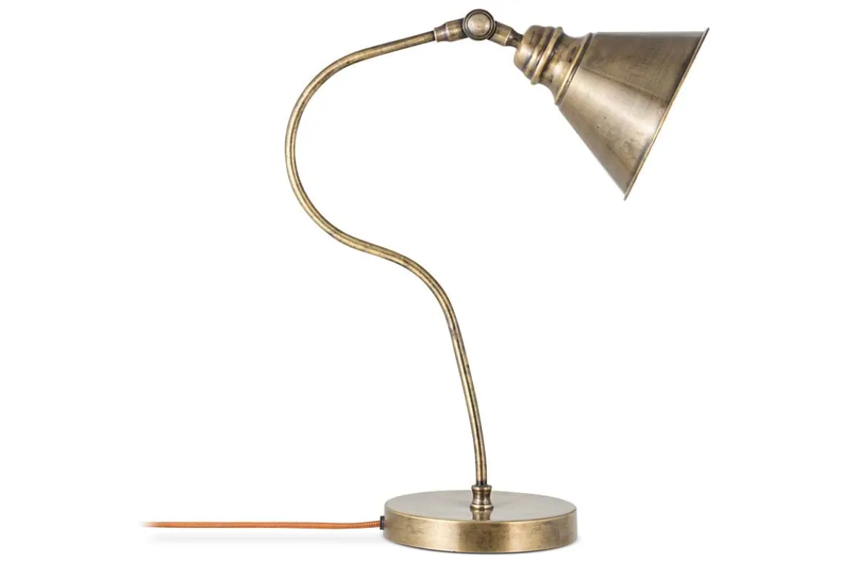 This antique brass Damba desk lamp has a classic silhouette, elevating an office space with its simple yet timeless look. The conical shade can be angled to create a pool of directional light that is perfect for illuminating work even if the lighting in the rest of the room remains low – ideal for desks that occupy a mixed-use living space. Its petite footprint makes it great for small spaces. Please note lighting does not include bulbs.