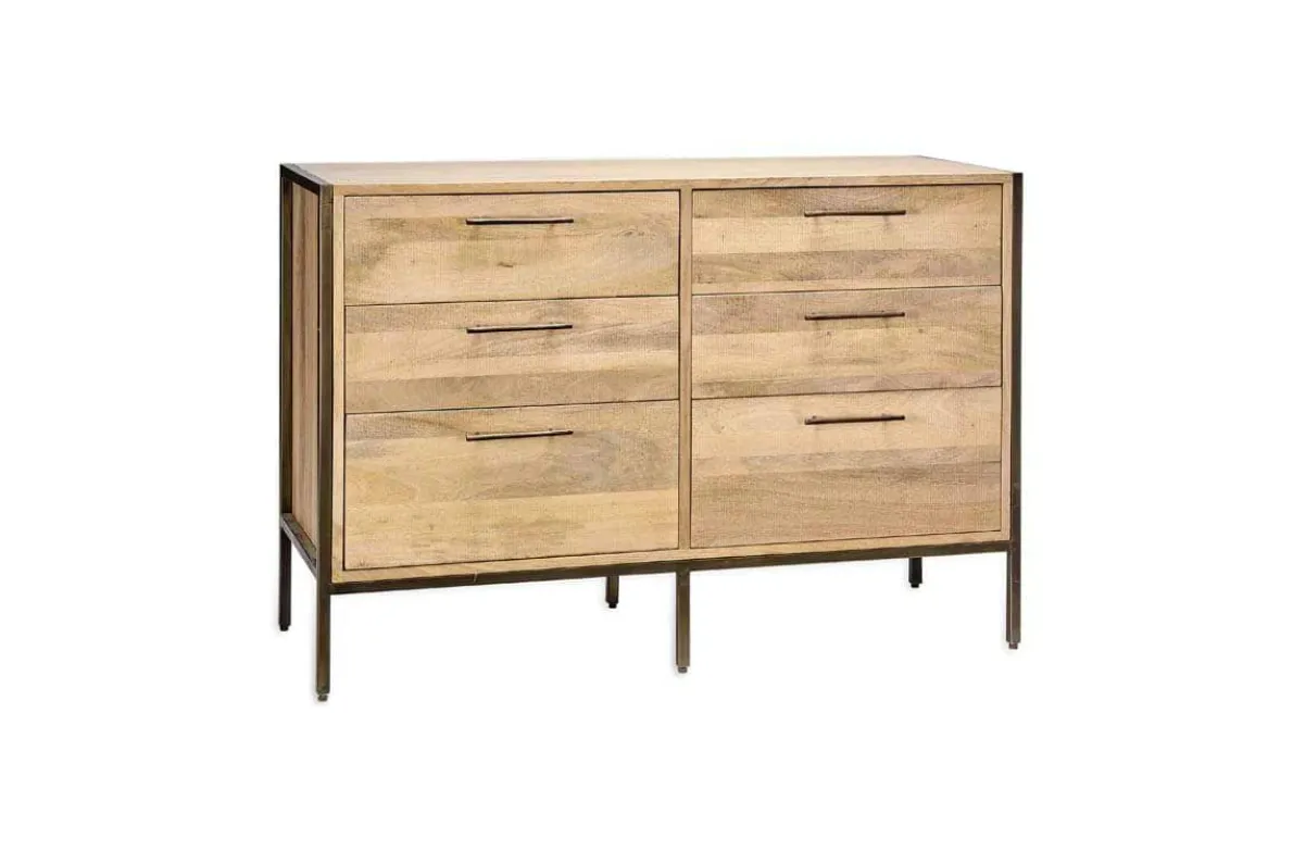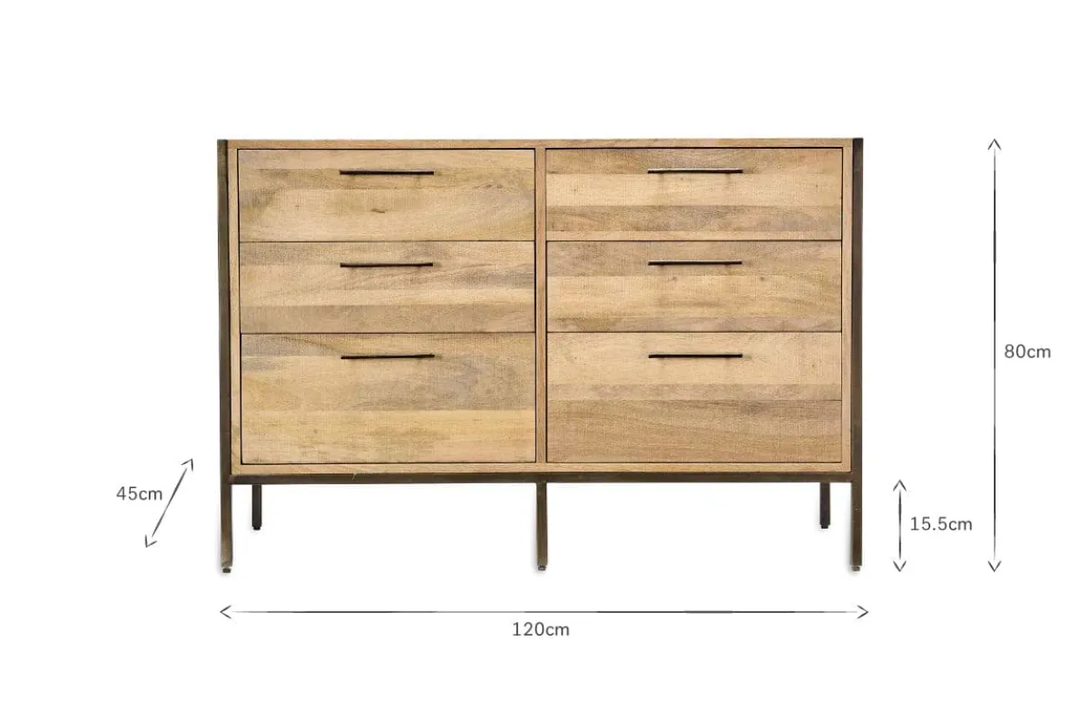 The natural light wood tones of our Dasai mango wood chest of drawers make this a versatile set of drawers that would fit perfectly in a bedroom. The modern design adds a contemporary look with the framework and legs crafted from sturdy iron and the drawer handles have a minimilist rolled bar design. The chest has six practical drawers with plenty of space for clothes. The top of the chest of drawers can be styled with photo frames, a jewellery box and a table lamp for an elegant display.
