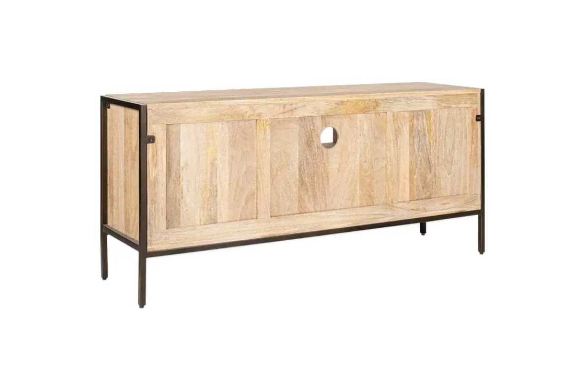 A new addition to our functional Dasai collection, the Media Unit will keep wires, consoles, hubs and controls neatly arranged and out of sight, while looking effortlessly stylish in any living space. Constructed from sustainable mango wood and sand-blasted for added texture to complement the natural grain, while contrasting the dark finish of the solid iron framework. Each cupboard has simple iron handles and comes with a single shelf centrally and on each side. This timeless piece works well as a conventional sideboard but has also been designed as a practical home entertainment console with a discrete access point for cables and plugs.