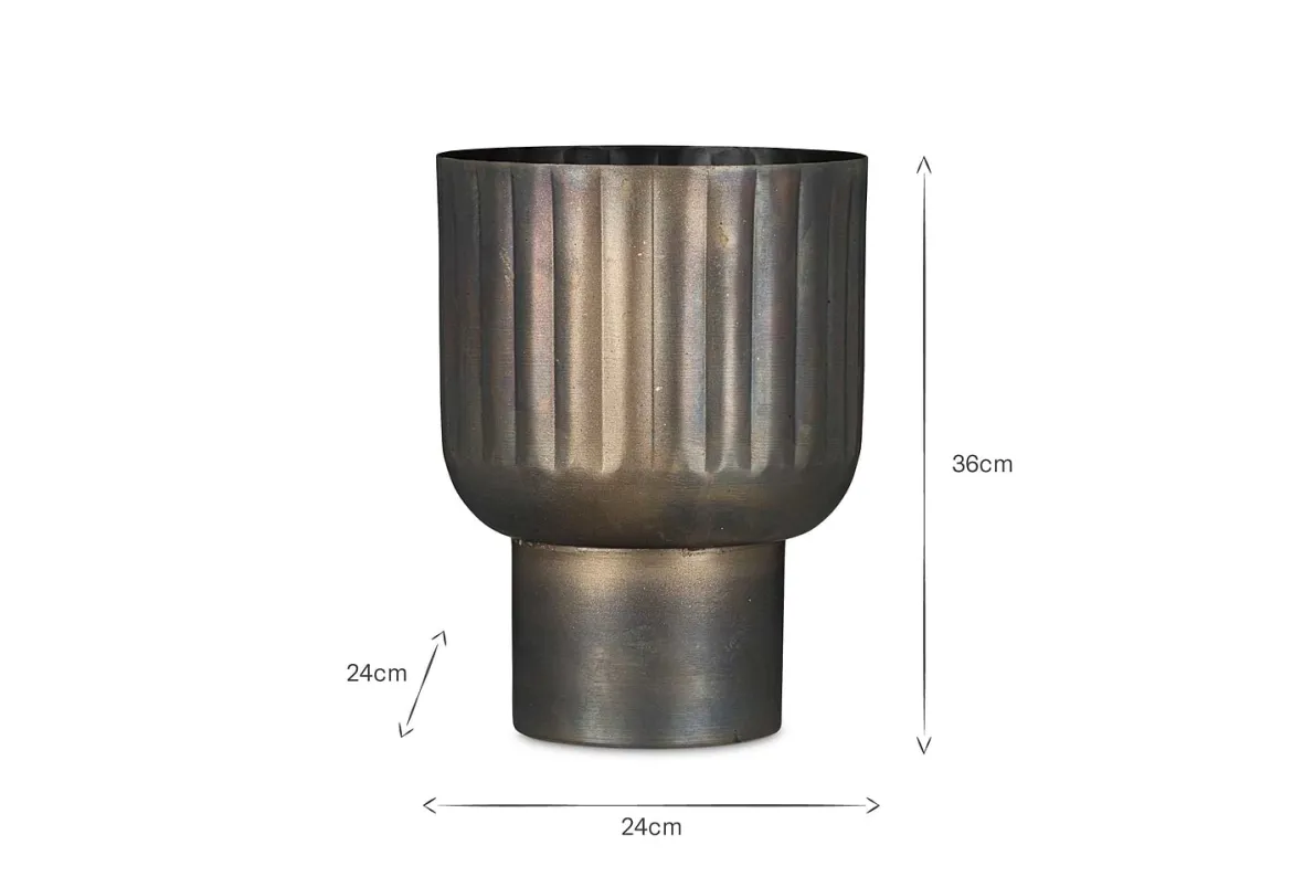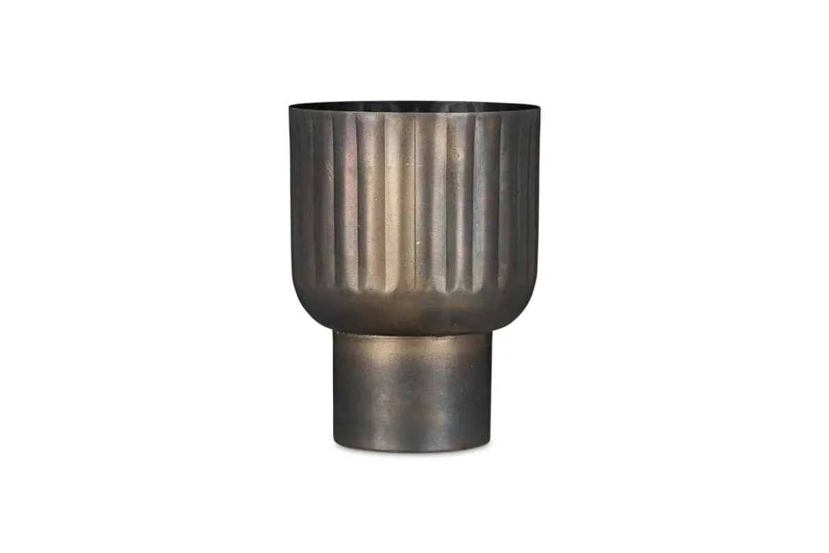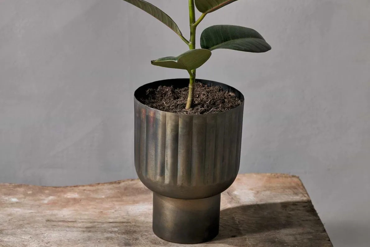 The antique brass finish and architectural form of our Dasalla planter make it a stylish and multifunctional addition to any living space. The etched groove design creates a subtle shadowed detail that brings additional texture to the piece and adds to the unusual silhouette. Whether alone or grouped with others, filled with foliage or empty, on the floor or on a sideboard, this planter creates a wonderful display to draw the eye wherever it is placed.
