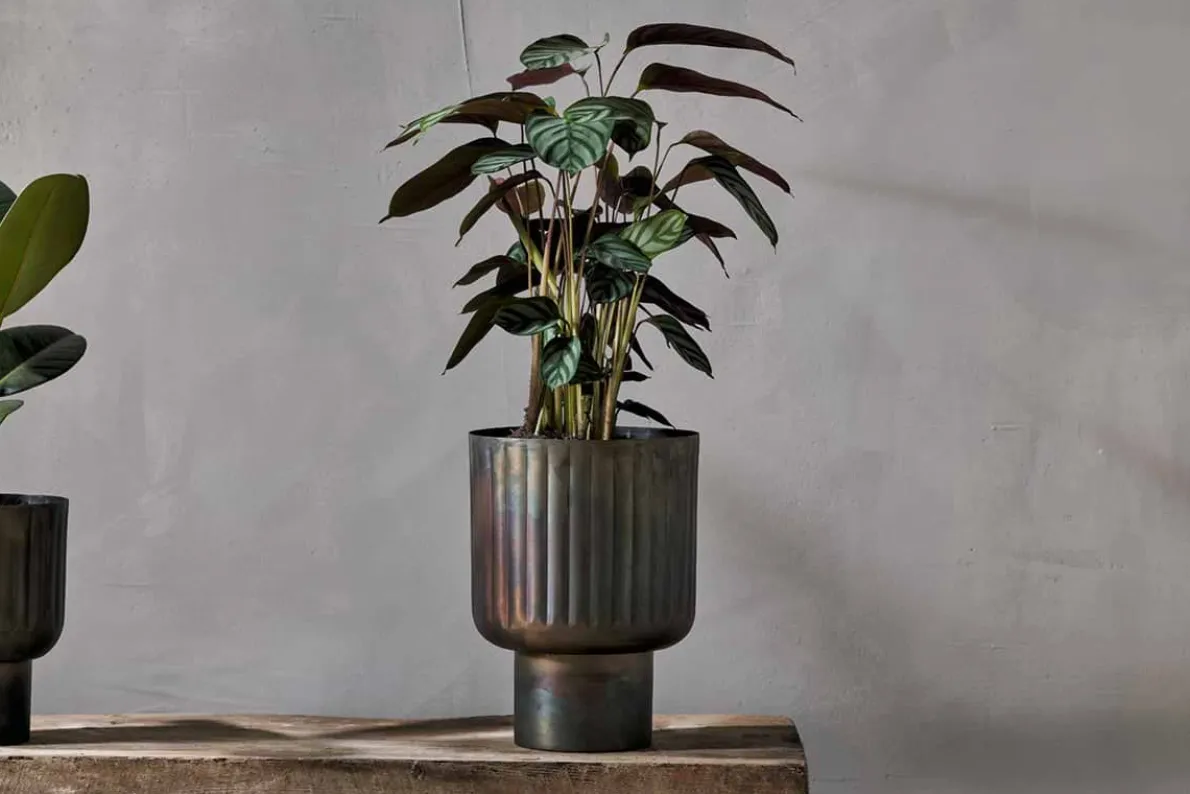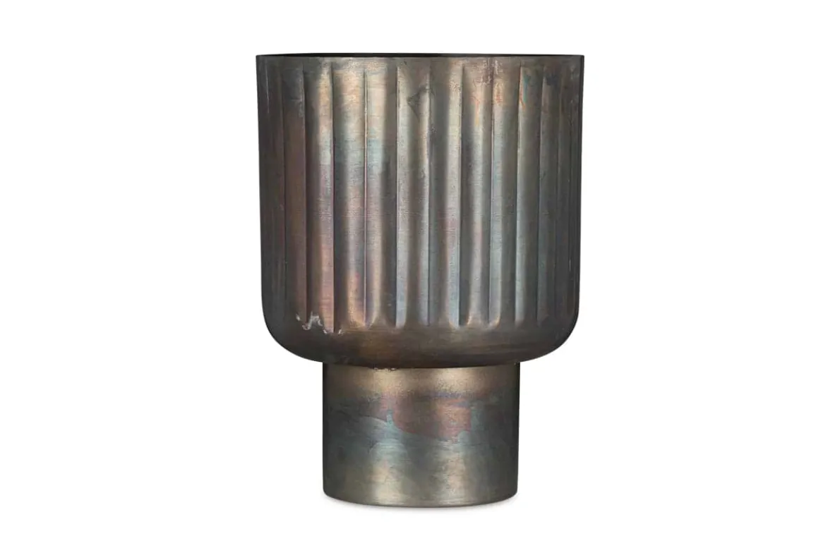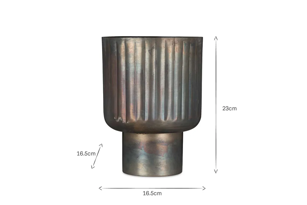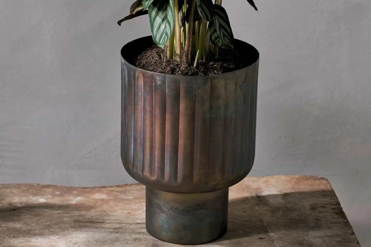 The antique brass finish and architectural form of our Dasalla planter make it a stylish and multifunctional addition to any living space. The etched groove design creates a subtle shadowed detail that brings additional texture to the piece and adds to the unusual silhouette. Whether alone or grouped with others, filled with foliage or empty, on the floor or on a sideboard, this planter creates a wonderful display to draw the eye wherever it is placed.