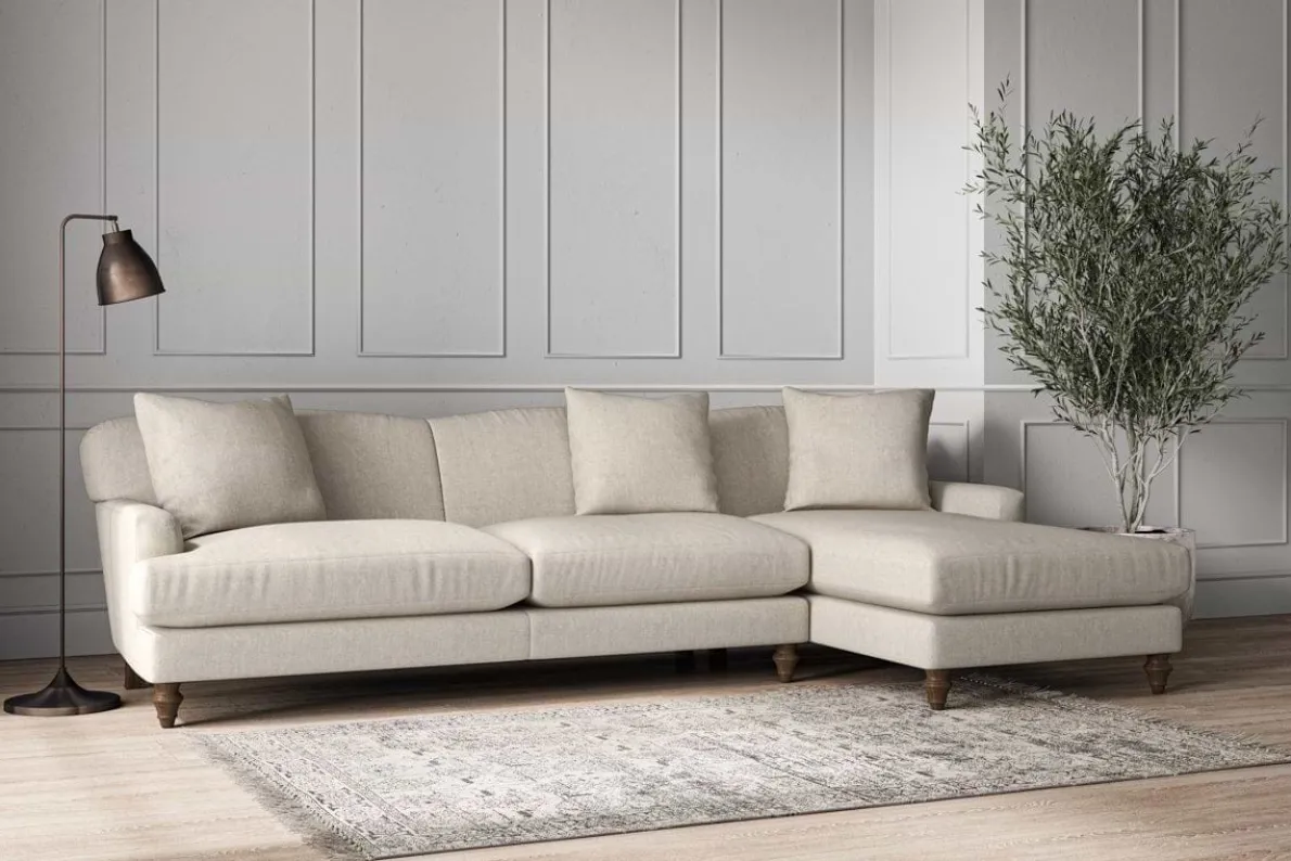 Our Deni grand left hand corner sofa is generously proportioned with deep, sumptuous seat cushions for luxurious comfort. Handcrafted from a solid hardwood frame with high-grade steel serpentine springs and foam and fibre wrap filling, this timeless collection celebrates the best of British quality and design. Fine details include in-built back cushions, hand-turned hardwood feet and a set of four scatter cushions for added comfort.