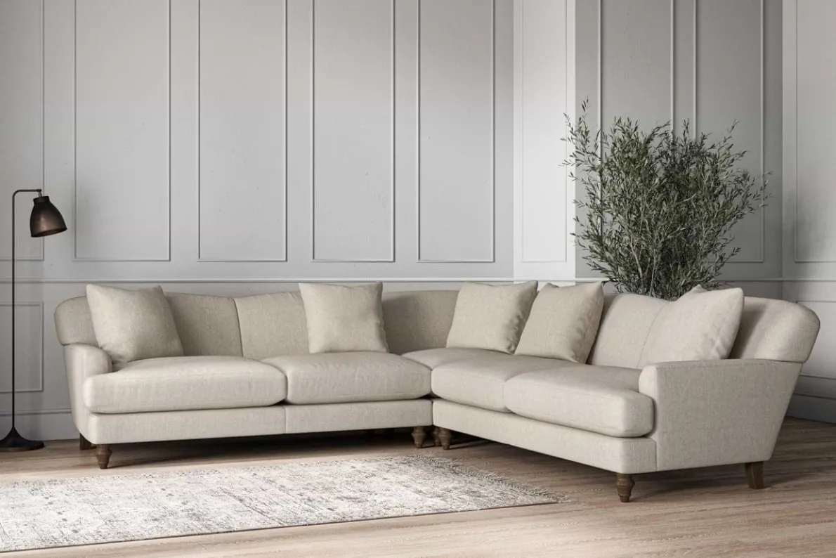 Our Deni large corner sofa is generously proportioned with deep, sumptuous seat cushions for luxurious comfort. Handcrafted from a solid hardwood frame with high-grade steel serpentine springs and foam and fibre wrap filling, this timeless collection celebrates the best of British quality and design. Fine details include in-built back cushions, hand-turned hardwood feet and a set of five scatter cushions for added comfort.