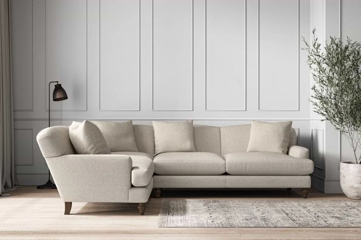 Our Deni large left hand corner sofa is generously proportioned with deep, sumptuous seat cushions for luxurious comfort. Handcrafted from a solid hardwood frame with high-grade steel serpentine springs and foam and fibre wrap filling, this timeless collection celebrates the best of British quality and design. Fine details include in-built back cushions, hand-turned hardwood feet and a set of four scatter cushions for added comfort.