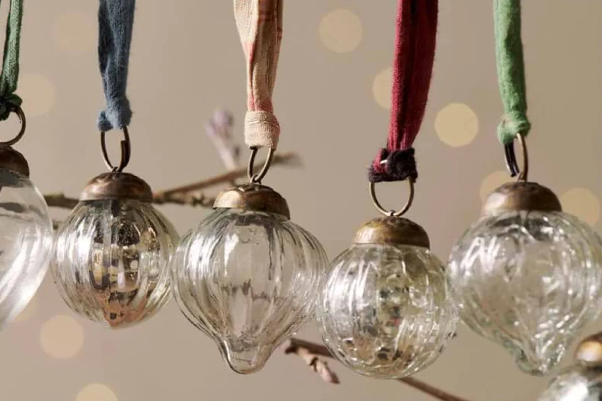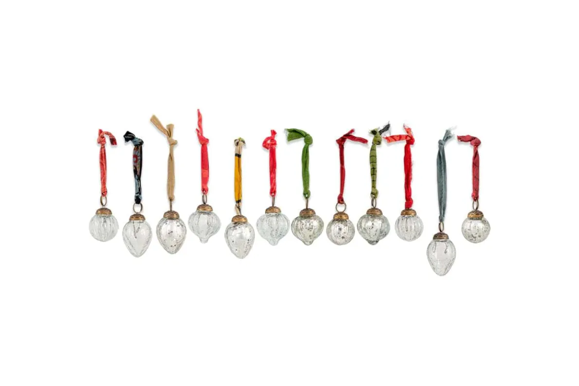 Our set of 12 Dew Drop Baubles provide a waterfall of rich antique colour to any festive decor. The gorgeous jewel-like shades of these exquisitely shaped baubles make them a wonderful finishing touch to a sumptuously decked-out tree or bare branch display. Finished with an antique-style clasp and elegant sari tie.