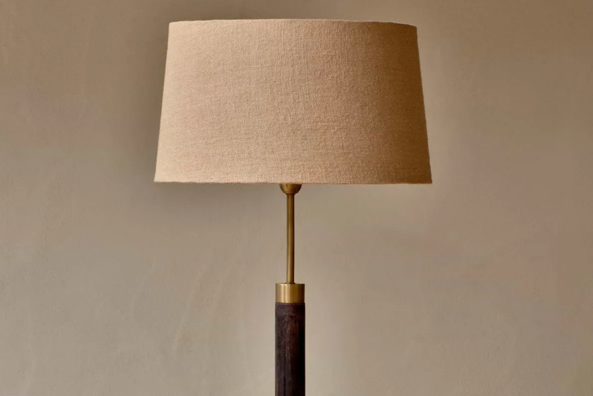 Our Digha Floor Lamp masterfully combines rustic dark-stained wood with antique brass elements, creating a warm addition that enriches any room. Featuring a functional pole design with a typically thicker body, this lamp has an impactful and intriguing silhouette. Its unique blend of materials and robust design make it a standout piece, perfect for adding depth and warmth to your living space. Also available as a table lamp.