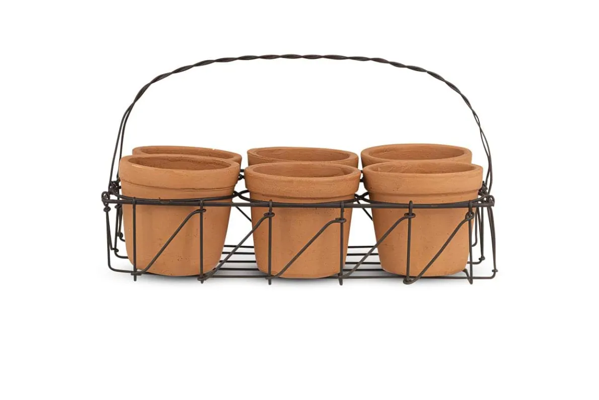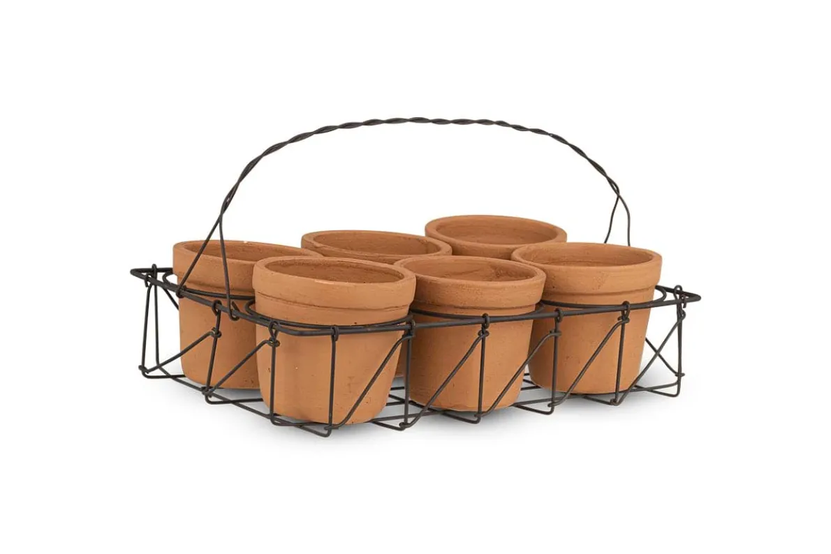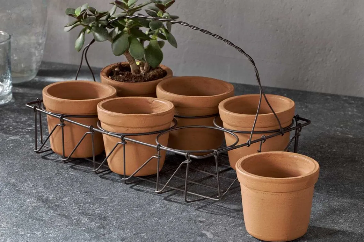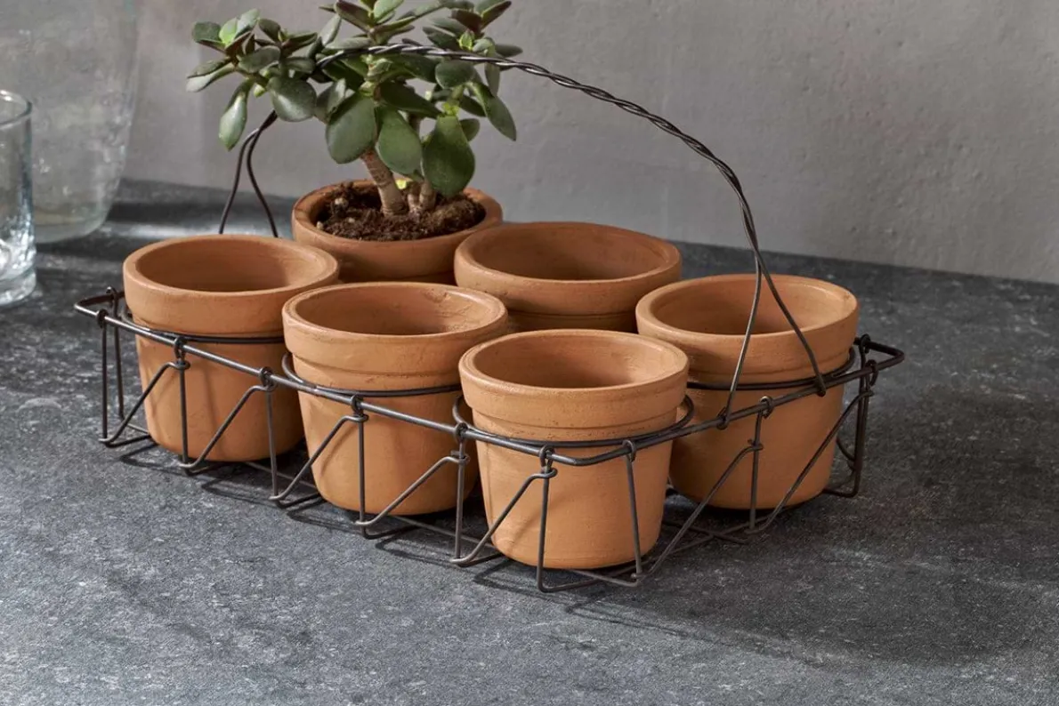 This Dilipa six-pot planter makes for a pretty addition to a kitchen counter. Ideal as a gift for foodies and gardeners alike, it creates the perfect space for a micro herbarium. Fill with basil, thyme, oregano, mint, or any other favourite herbs for an easy way to create a fragrant miniature edible garden. The variations in texture and tone of the terracotta pots bring natural warmth, while the simple wire basket creates a stylish way to keep everything neatly in one place.