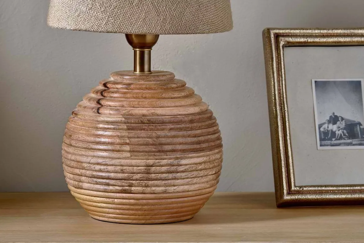 Made from sustainable mango wood and hand crafted in India, the relaxed aesthetic of the Drisana lamp makes it a perfect addition to a bedroom setting. The beautiful hand carved grooves and the warm tones of the wood are an effortless way to bring natural texture to an interior scheme. This lamp is made from multiple offcuts of mango wood, creating a beautiful pattern with subtle variations from the different grains, while reducing waste from offcuts at the same time.