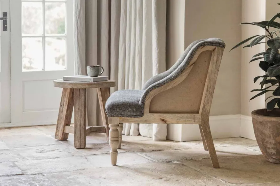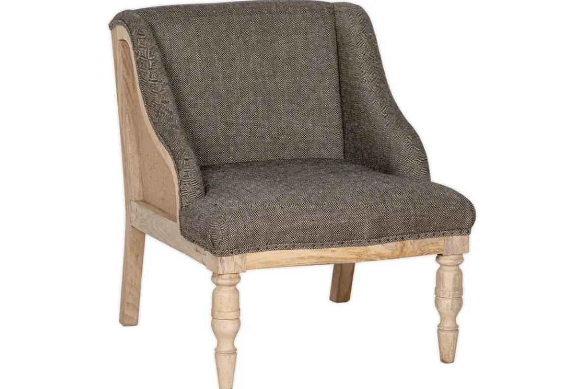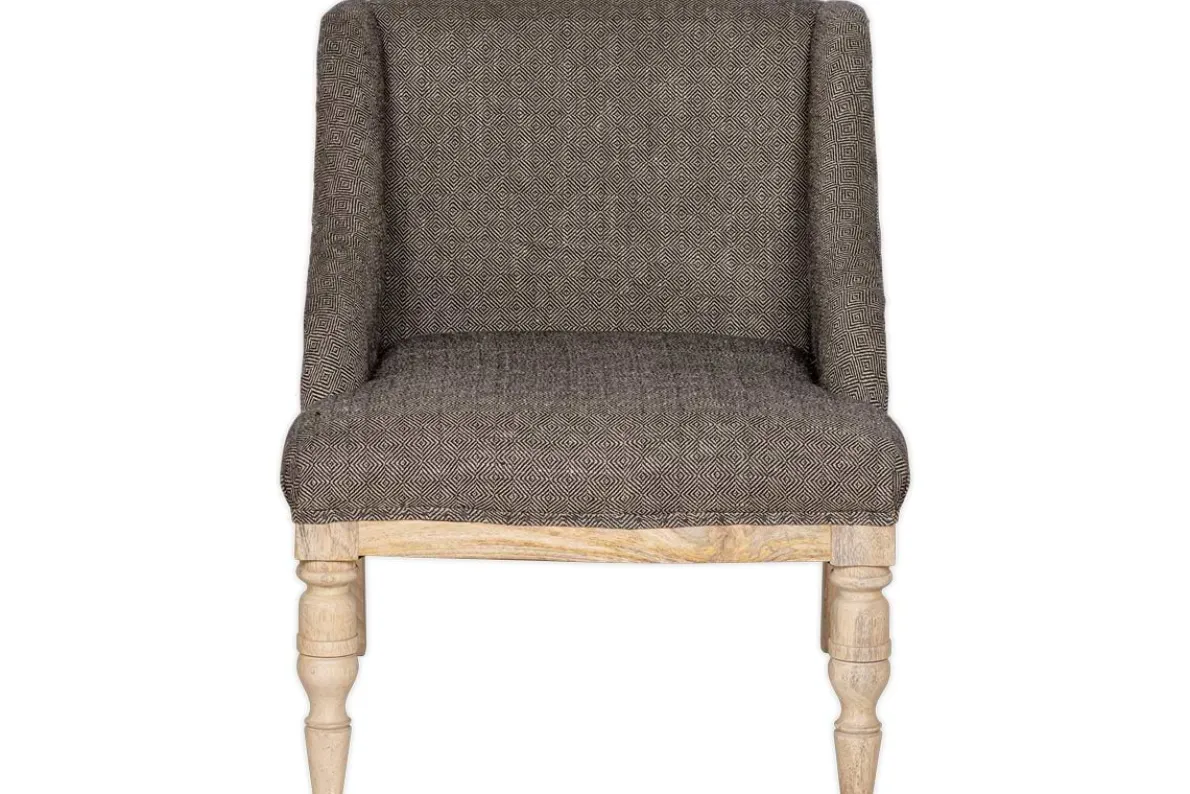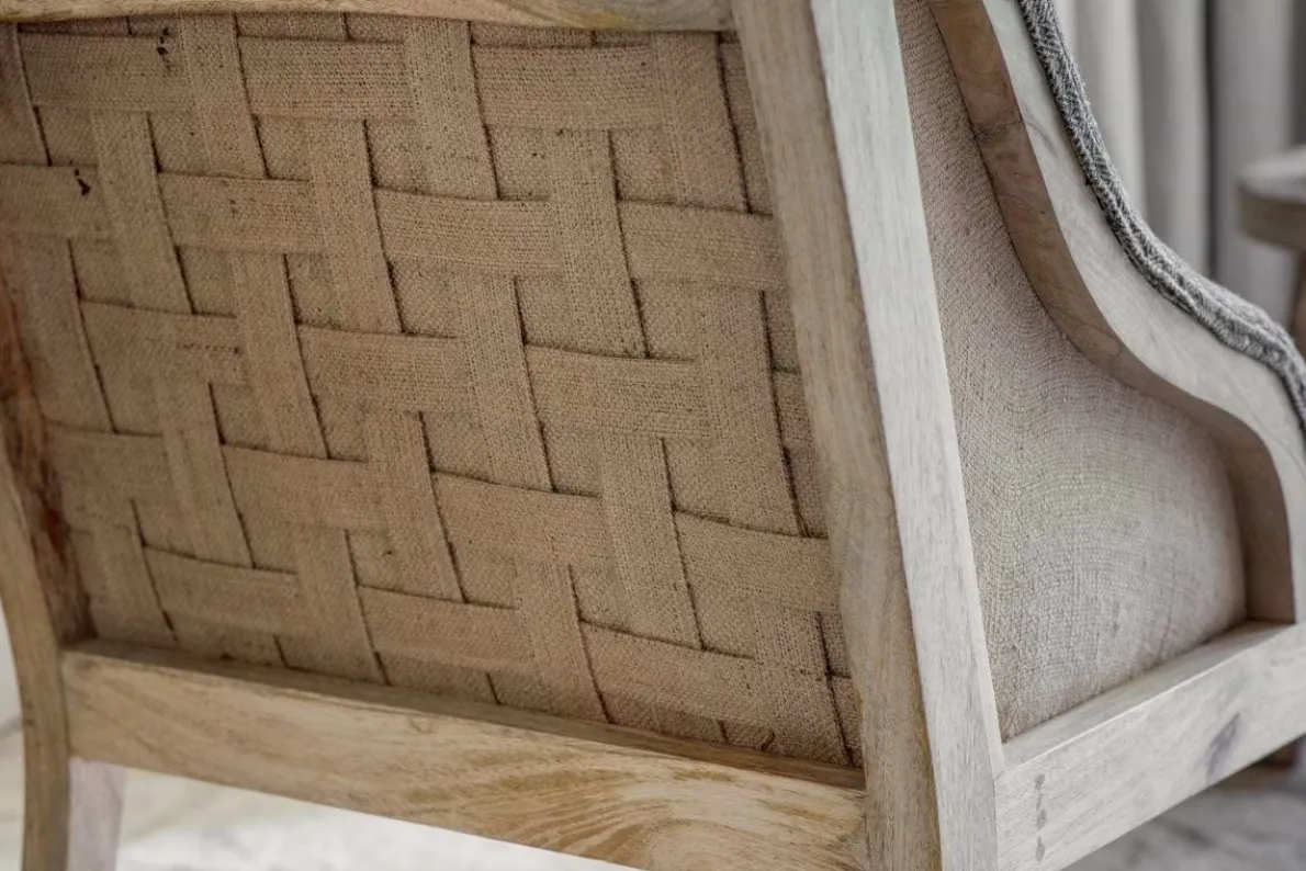 Our beautifully crafted Elbu chair is a timeless classic with a twist; the deconstructed back and sides reveal a natural mango wood frame and hemp panels for a pared-back aesthetic. Its elegant sizing makes it a subtle and elegant choice for a living space or bedroom. This new charcoal cotton and linen jacquard weave fabric is hand-upholstered for a timeless and striking addition to the Elbu collection.