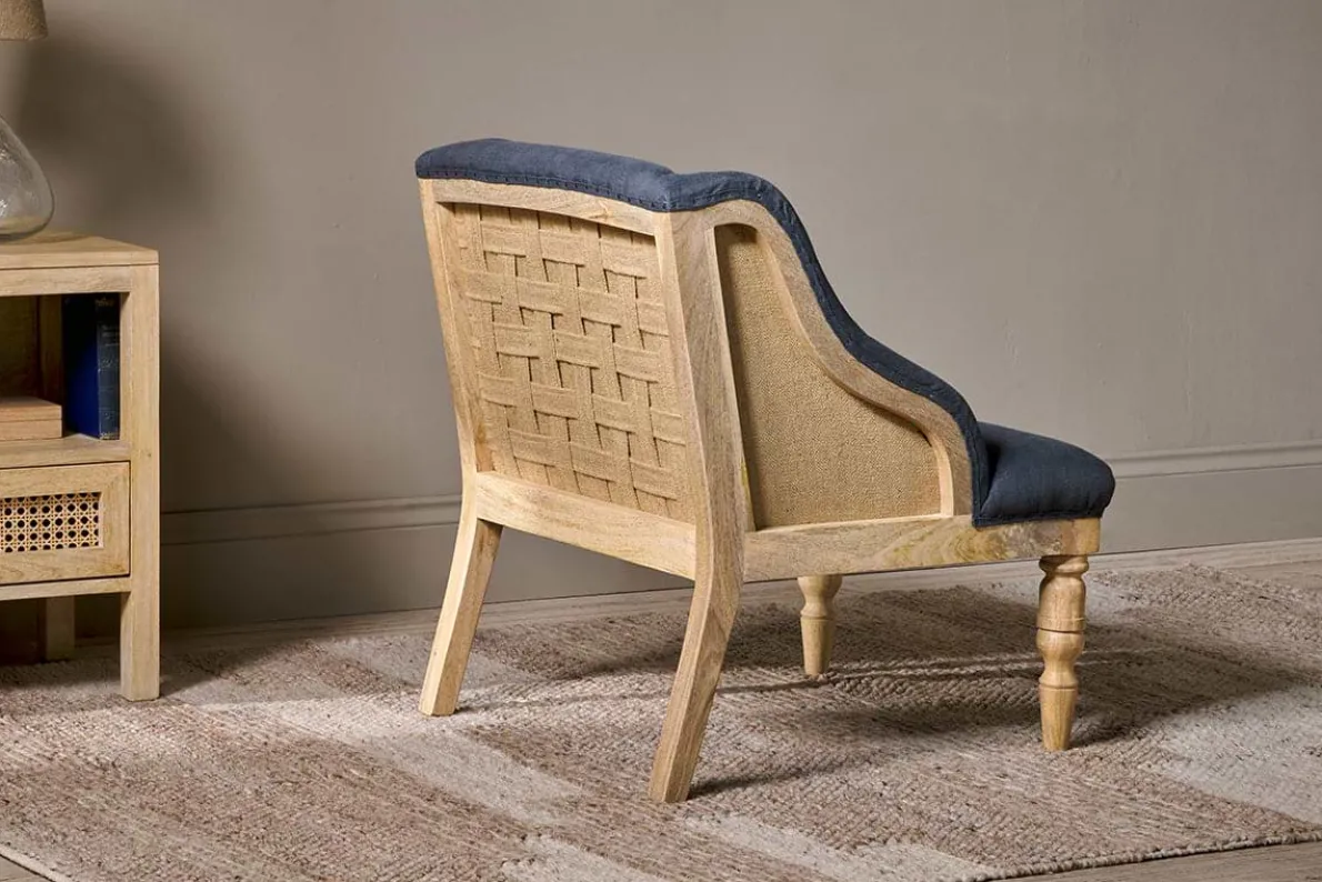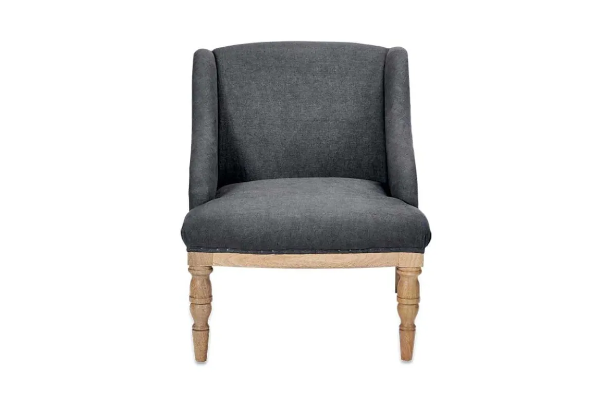 Our Ebu upholstered chair is a timeless classic with a twist, the deconstructed back and sides reveals a natural mango wood frame and hemp lining. The front is upholstered in a charcoal, tactile linen. These beautifully crafted pieces make a subtle and elegant addition to a living room or bedroom.