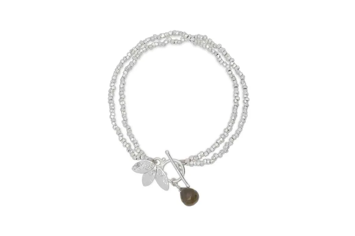 Our silver plated Elina labradorite bracelet has a delicately shaped chain and is finished with a hand-cut labradorite stone and hammered silver leaf design that creates an elegant charm. Labradorite is an iridescent stone that comes in a range of tones; – here we have chosen ones with a delicate grey hue for versatility when pairing with other pieces and because it captures the light beautifully, exuding an effortless grace and simplicity. Labradorite is associated with the throat and third eye chakra and is said to be connected to communication, wisdom and intuition.