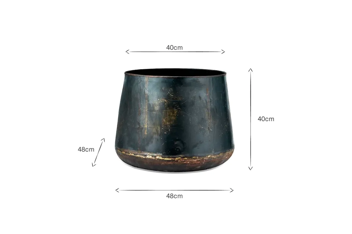 Our striking Endo reclaimed iron pots are made from recycled iron, gathered from old storage drums. The character of the reclaimed materials add detail and texture to these stand out planters. Display in a courtyard or garden.