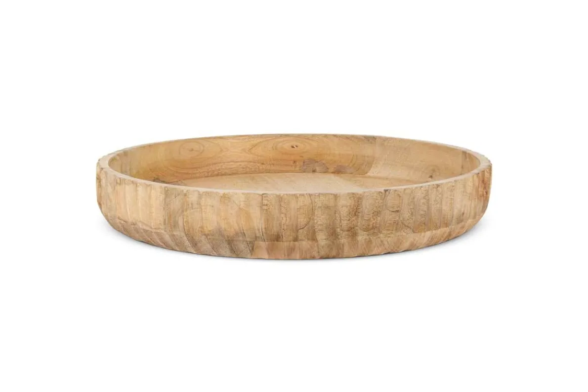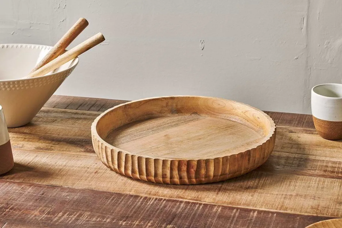The decorative hand carved etching that adorns the edge of the Gavivi shallow serving bowl adds a striking detail. The low sides and flat surface are perfect for serving cheeses, breads and other sharing foods. The natural grain of the mango wood has a varied and warm tone. The Gavivi displays beautifully on a coffee table or sideboard, bringing a warm natural tone. Mango wood is sustainable wood that has a light natural tone.