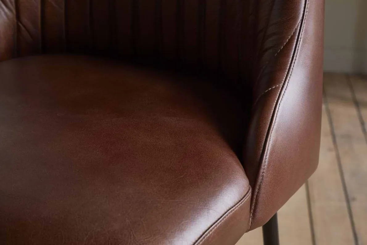 A natural extension of our Harsha leather collection, this counter-height chair pairs refined design with everyday comfort. Upholstered in buffalo leather dyed a rich chocolate brown, its ribbed finish adds texture and character. Supportive and generously proportioned, it-s perfect for kitchen islands or elevated dining tables.