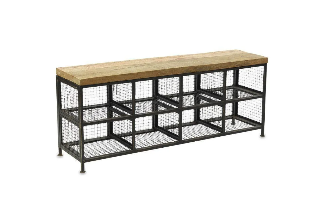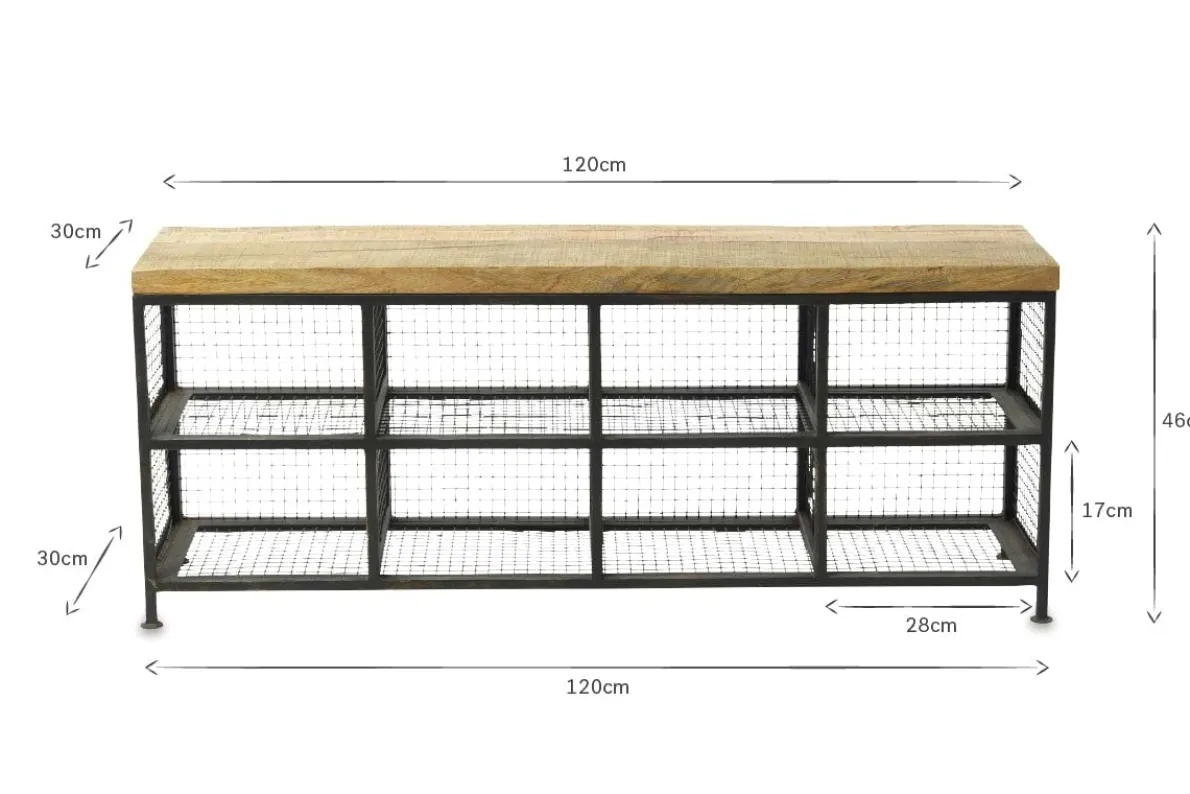This industrial mesh storage bench has eight useful compartments, ideal for keeping shoes and other items tidied away. The practical bench has a chunky natural wood bench seat.