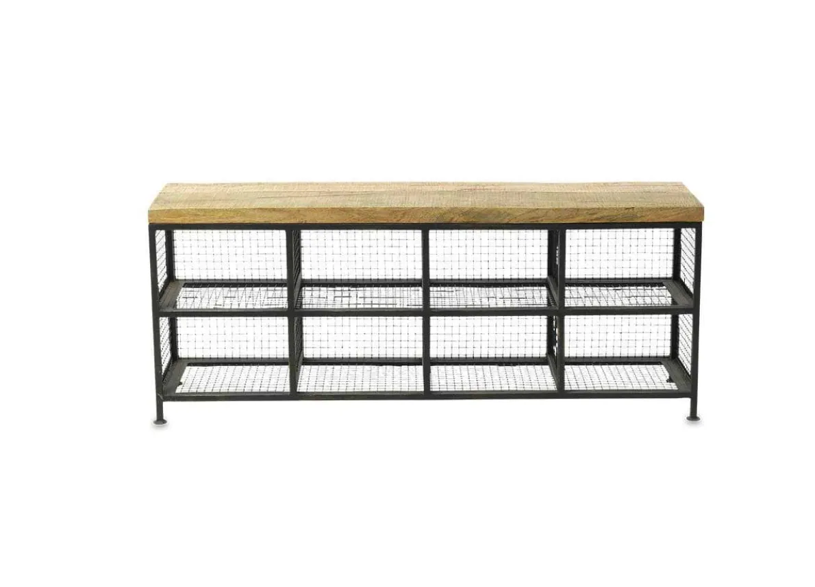 Every home faces the challenge of storage and space. Our Hasa industrial storage bench is the solution. Soldered from iron, this practical well-designed bench has eight useful compartments and a chunky mango wood top. It suits a hallway or utility room perfectly.