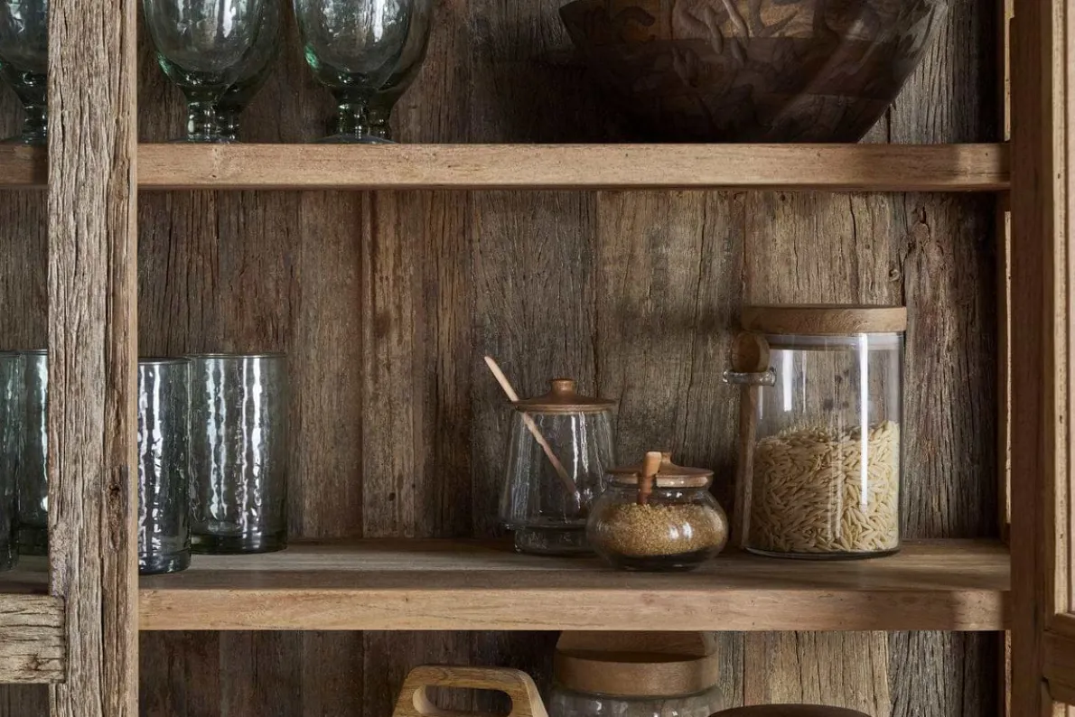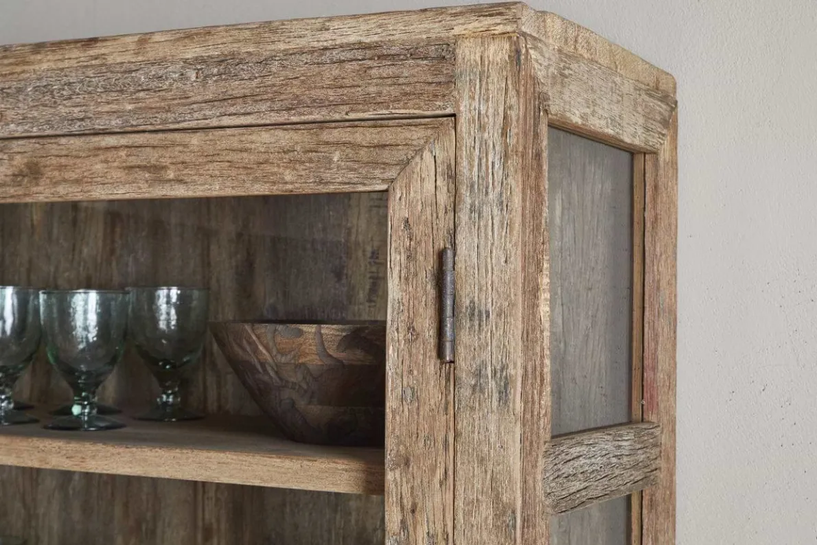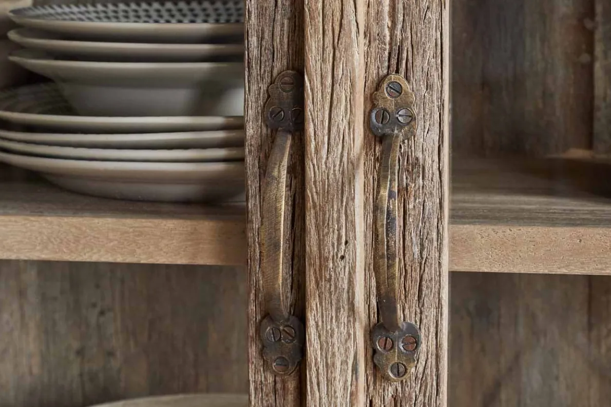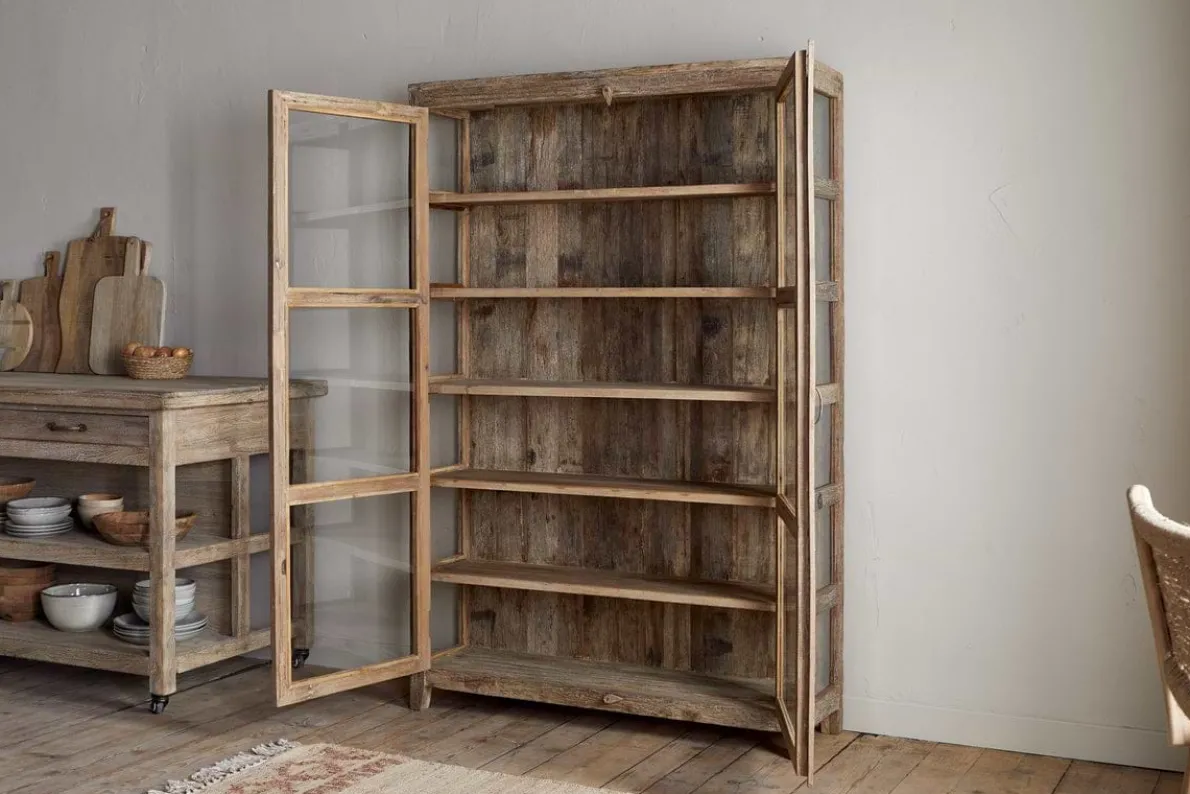 This rustic cabinet combines practical storage with timeless character. Designed with a simple, sturdy frame, it features six spacious shelves, ideal for organising pantry items, books, vases, or display pieces. Glass panels on the front and sides create a light, open feel, while antique brass handles add a touch of vintage charm. A versatile piece that brings warmth, texture, and functionality to any room.