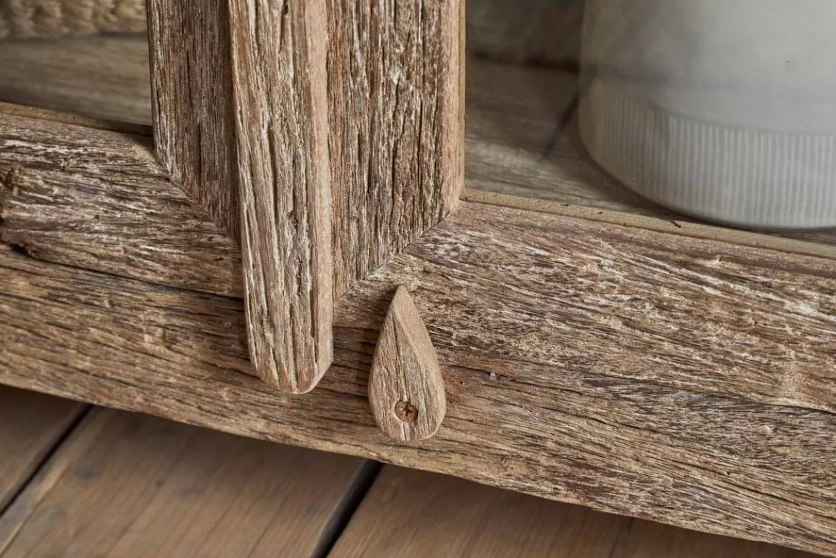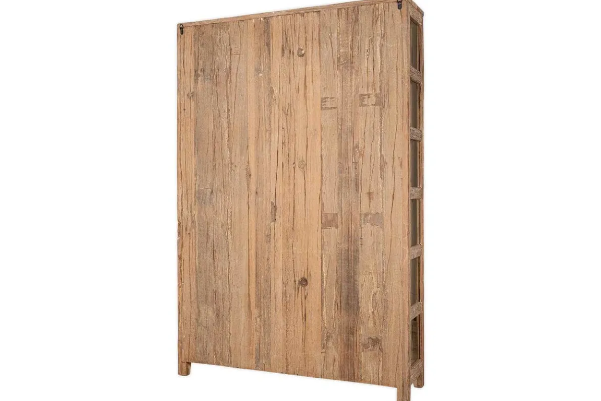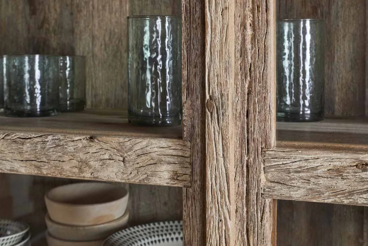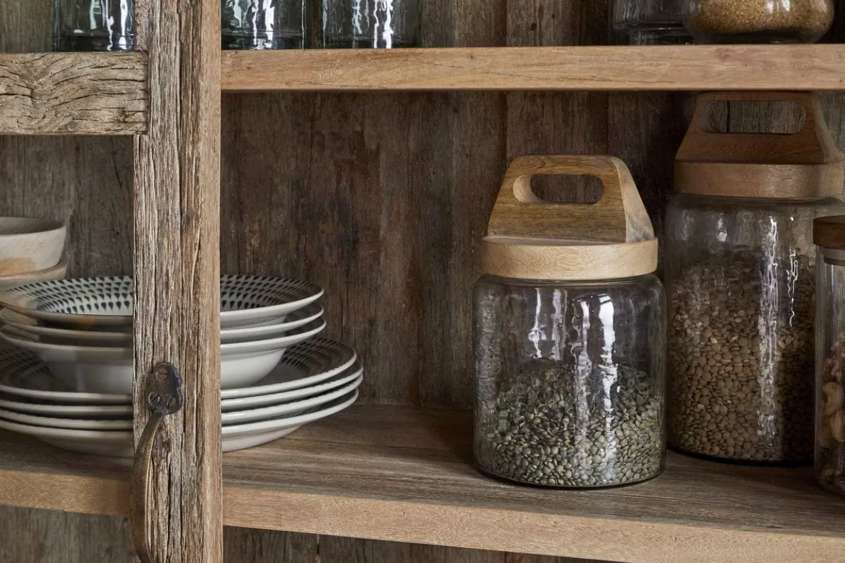 This rustic cabinet combines practical storage with timeless character. Designed with a simple, sturdy frame, it features six spacious shelves, ideal for organising pantry items, books, vases, or display pieces. Glass panels on the front and sides create a light, open feel, while antique brass handles add a touch of vintage charm. A versatile piece that brings warmth, texture, and functionality to any room.
