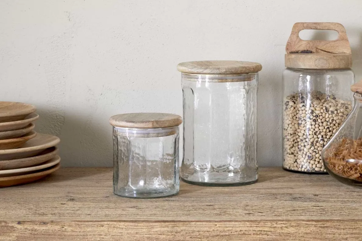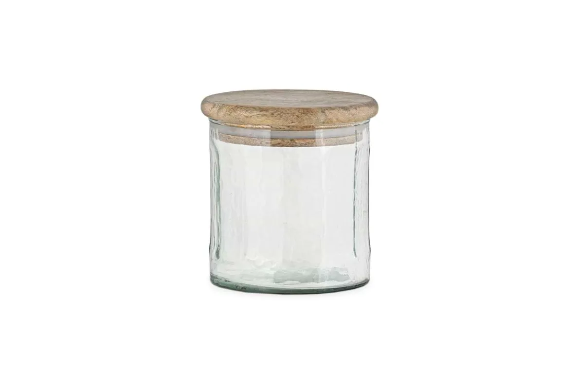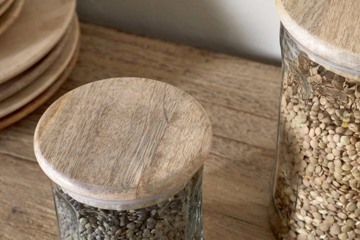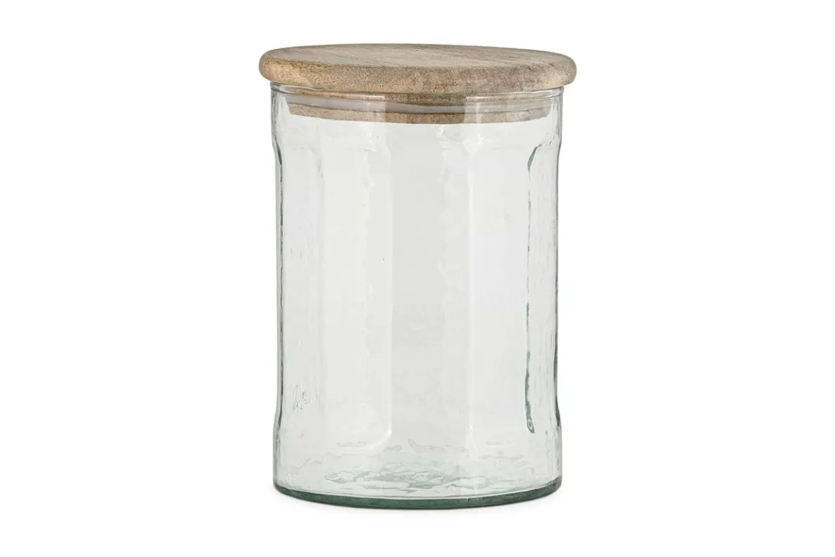 A practical and stylish storage solution, this jar features a clear glass body that keeps contents visible and easy to access. The smooth mango wood lid has a secure seal, helping to keep dry goods fresh. Its vintage-inspired shape and natural finish make it a versatile addition to any kitchen, perfect for everything from pasta to pulses.
