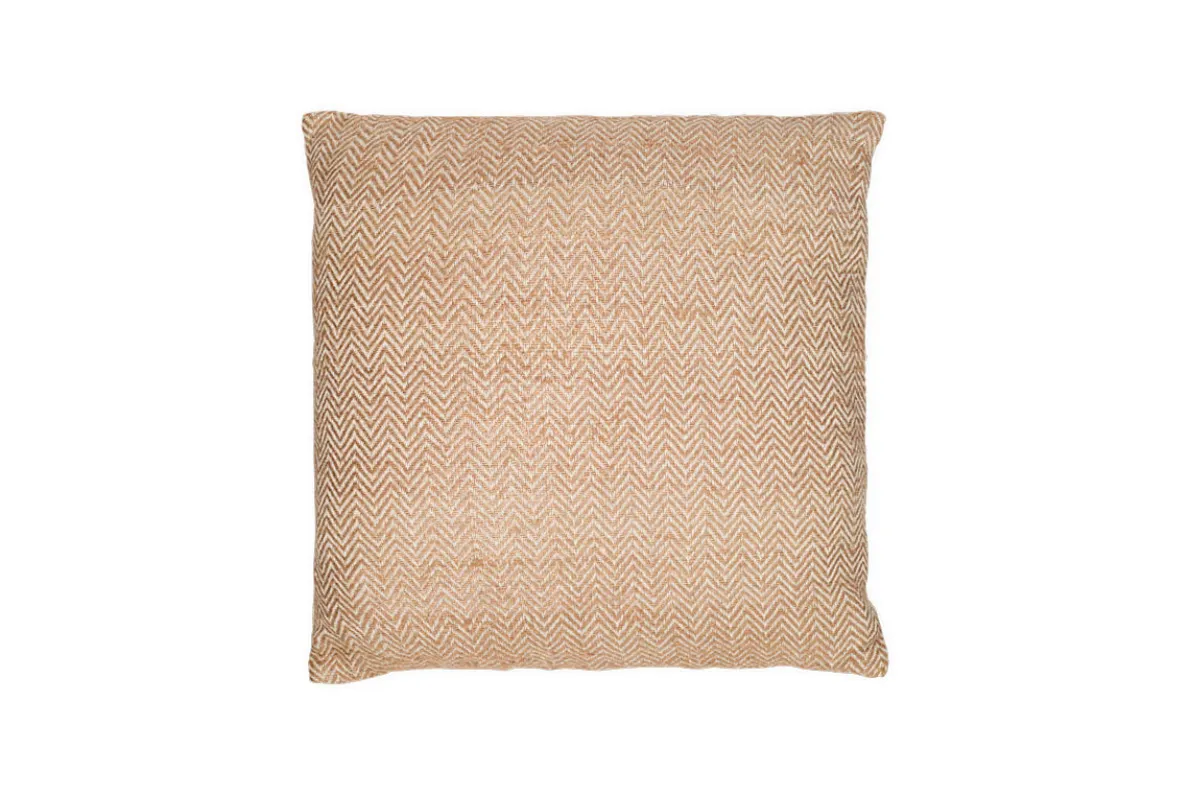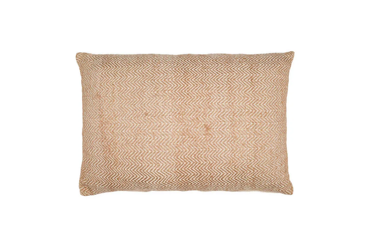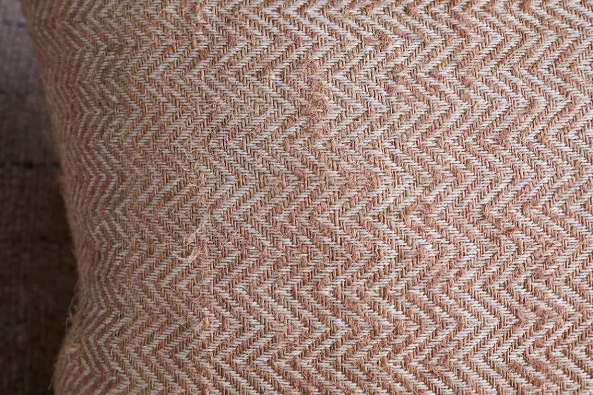 We are delighted by both the aesthetic and the ethics of these Indie cushions made from a blend of cotton and recycled plastic bottles. The soft dusky pink and rust tones of the fabric make them a fresh addition to any sofa or armchair, bringing an understated pop of colour and interest, while still sitting pretty within a neutral palette. The woven chevron design gives texture and tactility to this simple, durable piece that looks at home in any scheme and gives a new lease of life to a waste material that works beautifully as a long-lasting textile. Please note, this is the outer cover only. Available in two sizes. Our feather cushion inners will accompany your cushion cover perfectly. Please note, the size of the cushion inner will display slightly larger than our cushion covers to allow for a plump finish when put together.