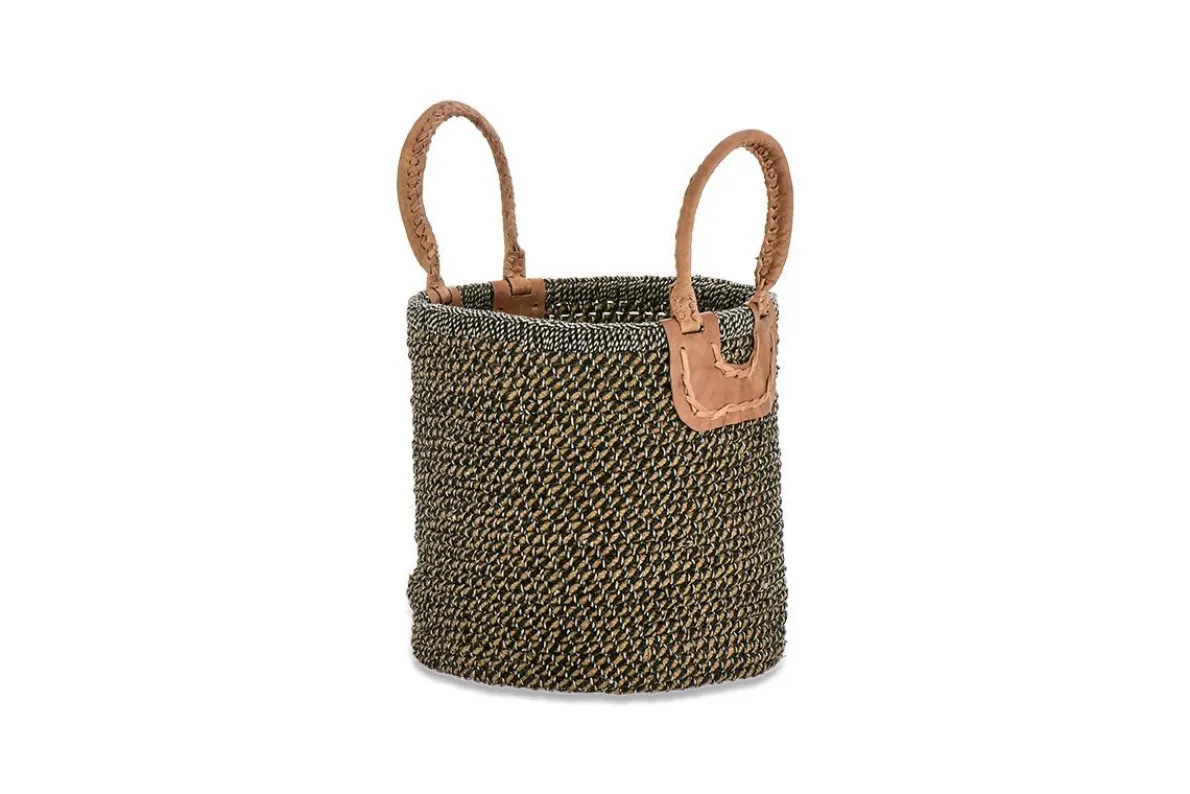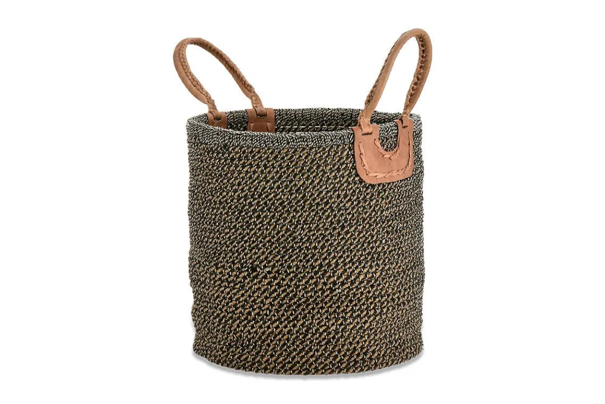 These wonderfully, crafted charcoal coloured baskets are handmade by NGO supporting rural craftswomen. They are naturally dyed, hand spun and woven using natural fibres. The baskets made up of a series of coils in this rigid shape. The handles are hand stitched from goat leather, naturally dyed with tree bark and vegetable extract.