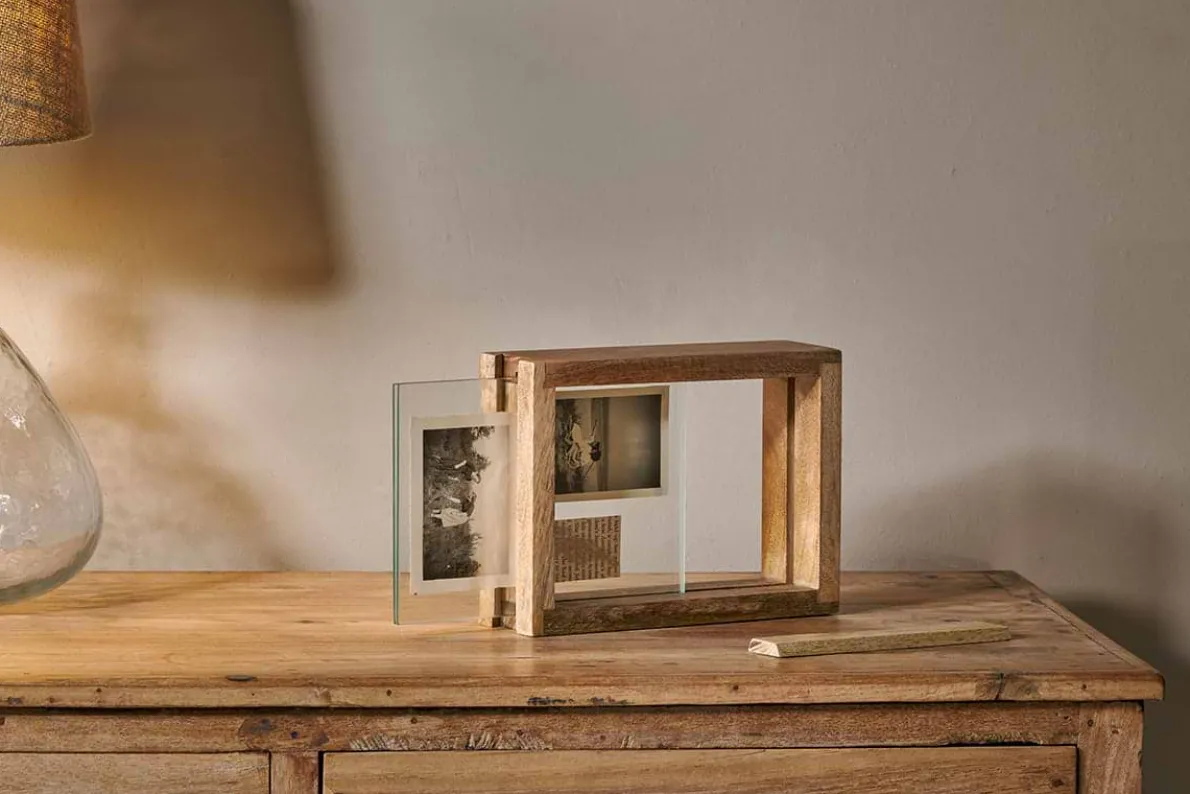 These stylish Indu standing frames have a chunky wood design, made with sustainable mango wood. The combination of natural wood and see-through glass makes this a timeless classic that really showcases the image within. This simple frame has a clever design. The reverse piece of glass slides out allowing you to place your photograph or artwork in place before sliding the glass panel back in.